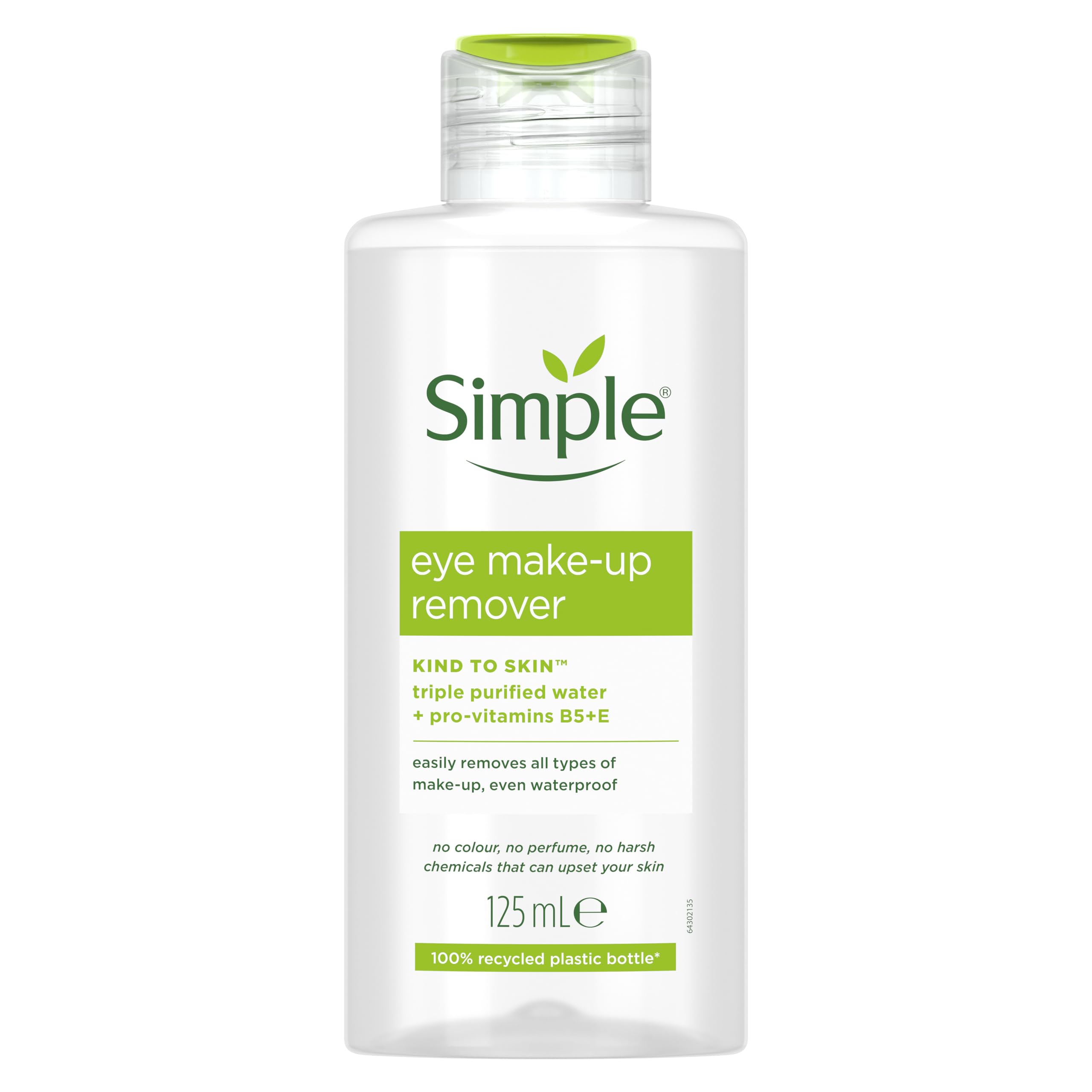 Product DescriptionStruggling to remove your eye make-up? We've got you covered! Simple Kind to Skin Eye Make-up remover effortlessly takes off eye make-up in one go, even waterproof mascara. The oil-free formulation of our gentle eye make-up remover soothes the delicate eye area with skin-loving ingredients that are also suitable for contact lens wearers. The skin around your eyes is really delicate, which is why it needs some proper TLC. Our eye make-up remover is ideal for all skin types, even sensitive skin. This Simple product is made with the perfect blend of gentle cleansers and contains multi-vitamins like vitamin E and pro-vitamin B5. Our Simple eye make-up remover contains no artificial perfume, colour or alcohol and no harsh chemicals that can upset your skin. We believe in continuously working to be kinder to the planet. That's why Kind to Skin Eye Make-up Remover is PETA certified cruelty-free and vegan. Globally, Simple does not test on animals. Our eye make-up remover also comes in post-consumer recycled (PCR) plastic bottles that are 100% recyclable with their lids. Our eye make-up remover is both dermatologically and ophthalmologically tested. So whether you’re wearing make-up day or night, our product easily removes it all without irritating or stinging your eyes, making it a great mascara remover. How to use: Step 1: Apply Simple make-up remover to a cotton pad or eye pads. Step 2: Wipe gently around your eye without rubbing. Make sure to try our other eye care products such as our eye roll-on, eye cream, eye balm and make-up removing eye pads.IngredientsAqua, Poloxamer 184, Butylene Glycol, Ceteth-20, PEG-20 Glyceryl Laurate, Laureth-23, Panthenol, Phenoxyethanol, Disodium Phosphate, Sodium Phosphate, Calcium Disodium EDTA, Hydroxypropyl Cyclodextrin, Pantolactone,Tocopheryl Acetate, Iodopropynyl Butylcarbamate, BHT.DirectionsFor best results... Apply to cotton wool and wipe gently around your eye without rubbing.Safety WarningFor best resultsApply to cotton wool and wipe gently around your eye without rubbing.Manufacturer Contact InformationUnilever Foods UK, Unilever House, Leatherhead, Surrey, KT22 7GR.