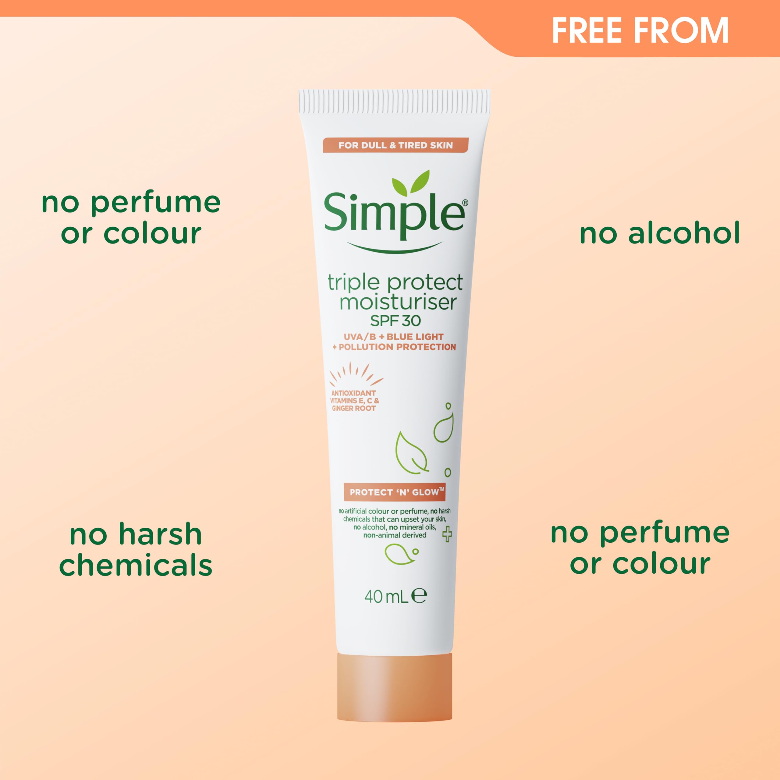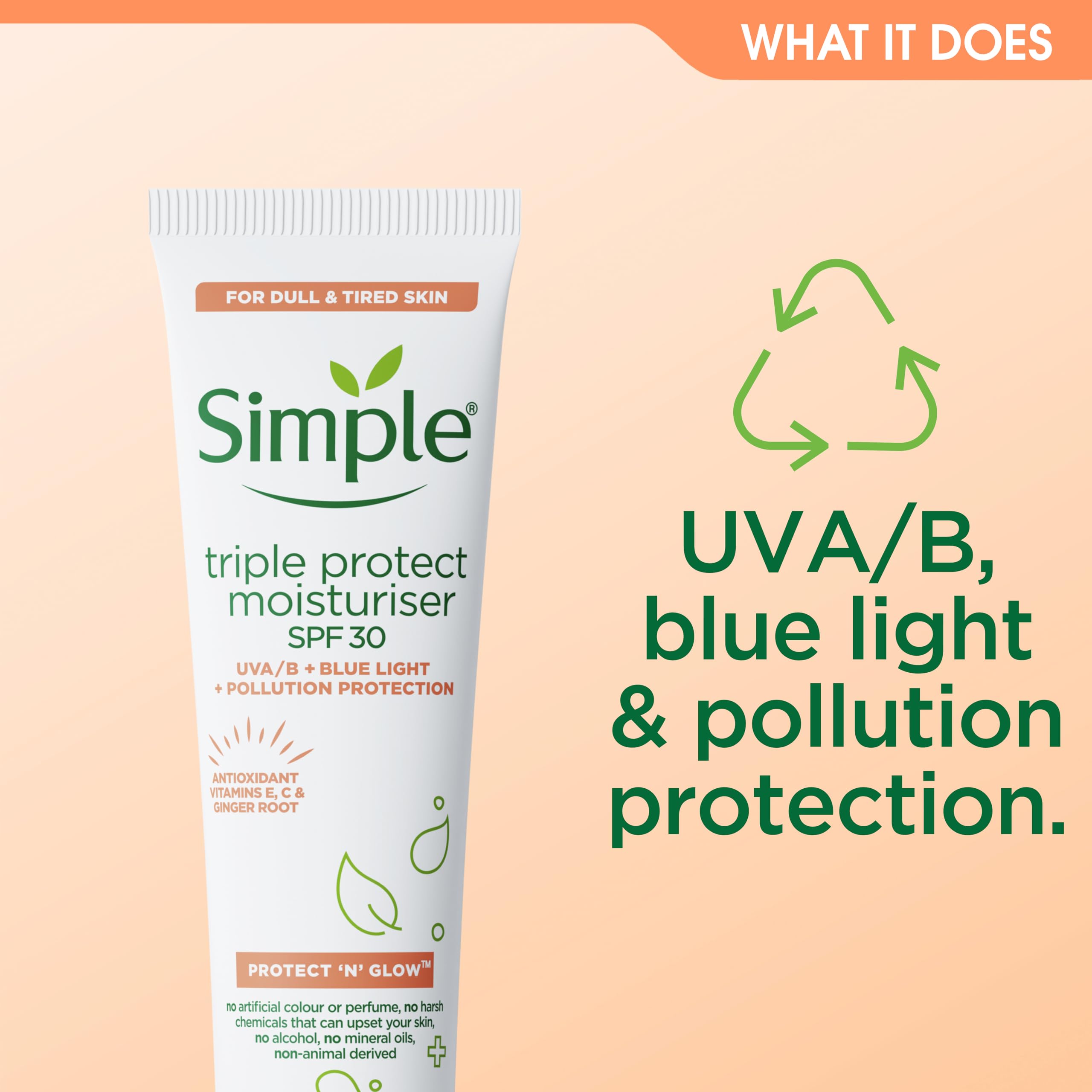 Moisturising, sun-protecting and super lightweight? Yep, our Simple Protect ‘N’ Glow Triple Protect Moisturiser SPF 30 is your all-in-one secret weapon - think sun-protected, naturally glowing skin, without that greasy feeling. But, get this - the sun isn’t the only thing damaging your skin. Overexposure to everyday pollution and even blue light from your fave electronic devices can secretly attack your skin, leaving it looking dull and feeling sensitive. Add Protect ‘N’ Glow vitamin C & E face cream - AKA your anti-pollution BFF that shields against potential skin-damaging elements of modern life: UVA & UVB rays, pollution and blue (electronic) light - to your daily skincare routine to help protect your skin from premature skin damage. With skin-loving ingredients like vitamins C & E, prebiotics and organic ginger root, our Triple Protect Moisturiser with SPF 30 boosts your skin's anti-oxidants. It's fast-absorbing and can be used alone or as a non-greasy primer before your make-up. Like all Simple products, this hydrating face cream is free from artificial colour and perfume and has no harsh chemicals that can upset your skin. Dermatologically tested, hypoallergenic and non-comedogenic, it’s an absolute dream for sensitive skin. How to use: Apply gently every morning to a clean face and neck. Our tip: stash it in your bag for quick sun protection top-ups, while moisturising all day for non-stop radiant skin. For best results, use after our Protect ‘N’ Glow Express Glow Clay Polish.IngredientsAqua, Ethylhexyl Methoxycinnamate, Dimethicone, Glycerin, Caprylic/Capric Triglyceride, Zinc Oxide, Isopropyl Myristate, Isohexadecane, Steareth-21, Cetearyl Alcohol, Dimethicone Crosspolymer, Steareth-2, Phenoxyethanol, Ammonium Acryloyldimethyltaurate/VP Copolymer, Glyceryl Stearate, Caprylyl Glycol, Xanthan Gum, Polyhydroxystearic Acid, Citric Acid, Disodium EDTA, Niacinamide, t-Butyl Alcohol, Sodium Ascorbyl Phosphate, Tocopheryl Acetate, BHT, Zingiber Officinale Root Juice.Safety WarningWarning: for external use only. Avoid getting into your eyes.for external use only. Avoid getting into your eyes.
