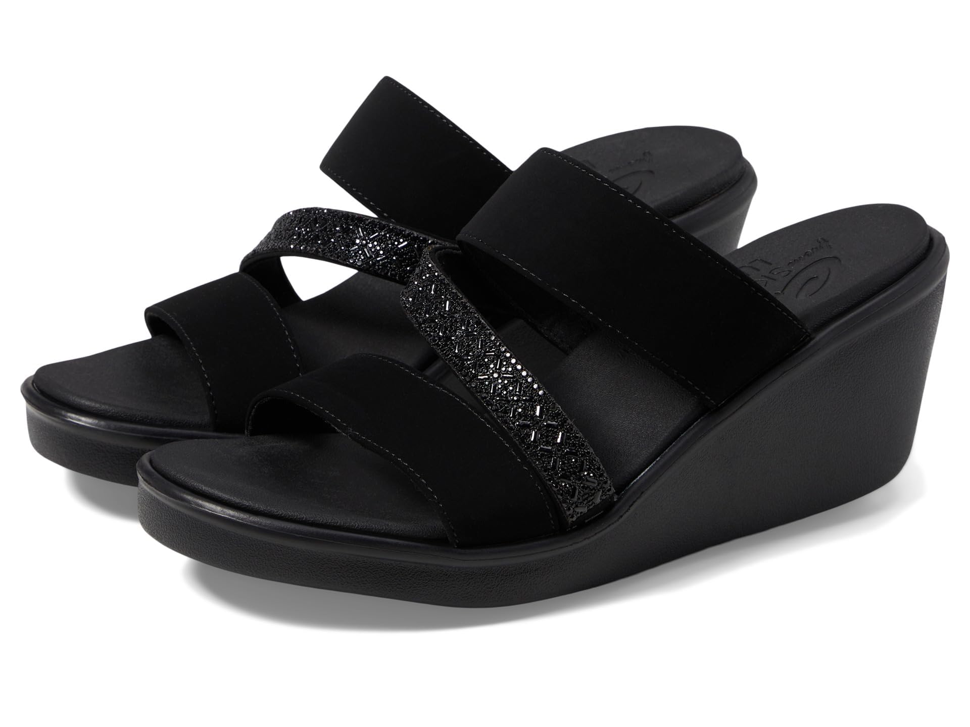 DescriptionHeat things up in a pretty look with stretchable cushioned comfort with the SKECHERS Cali Rumble On - Social Glam sandal. Smooth stretch fabric and smooth synthetic upper in a wedge heeled comfort strappy slide sandal with glittering rhinestone detail. Luxe Foam® footbed.
