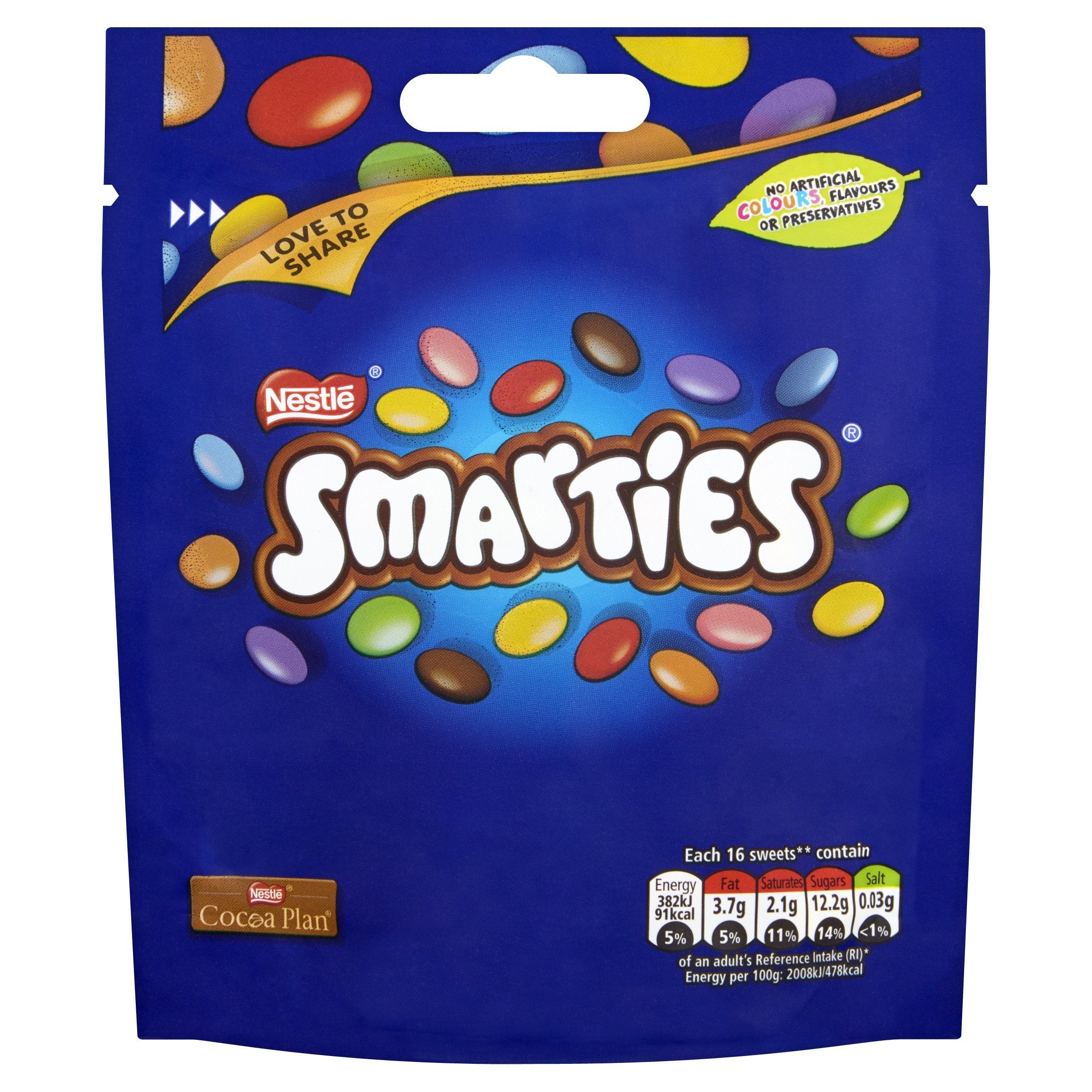 DescriptionProduct DescriptionGet together with friends, family film night or just for a special treat, share the delicious colourful fun of Smarties Buttons. Yummy smooth milk chocolate buttons filled with colourful mini Smarties sweets. Deliciously smooth milk chocolate has been at the heart of Smarties for more than 80 years and, in 2005, Smarties were the first UK major confectionery brand to move to no artificial colours.IngredientsSugar, Skimmed MILK Powder, Cocoa Mass, Cocoa Butter, WHEAT Flour, Butterfat (from MILK), Rice starch, Emulsifier (Lecithins), Colours (Beetroot Red, Carotene, Curcumin), Natural Flavouring, Spirulina Concentrate, Glazing Agents (Carnauba Wax, Beeswax White), Fruit and Vegetable Concentrates (Safflower, Radish) BARLEY Malt Extract.Safety WarningImportant: Young children (less than 4 years) have limited chewing ability and could choke on small sweets.Manufacturer Contact InformationNestlé UK Ltd, 1 City Place, Gatwick, RH6 0PA