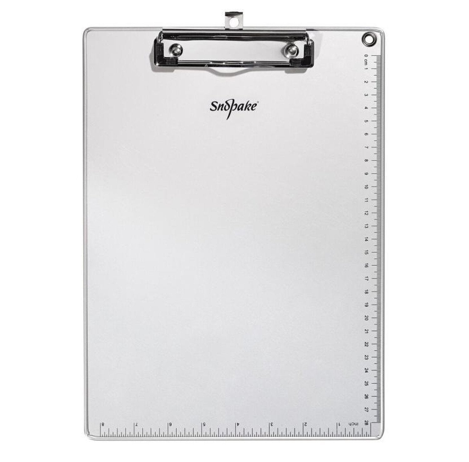 The Snopake Metallic Clipboard is the perfect document storage solution.The strong and lightweight clipboard holds up to A4 paper in a heavy duty clip, ensuring your documents are secure. The clipboard is ideal for holding loose papers, forms and documents.Snopake’s Metallic Clipboard comes with a hole on the top corner, where you can conveniently hang or pens and pencils, making sure you have everything at hand. A handy measurement guide on the side and bottom of the clipboard removes the need for additional stationery like a ruler or measuring tape.The versatile clipboard also allows you to store your documents in perfect condition, removing the need for a hole-punch. The all-in-one clipboard comes in white with a metallic silver edge.