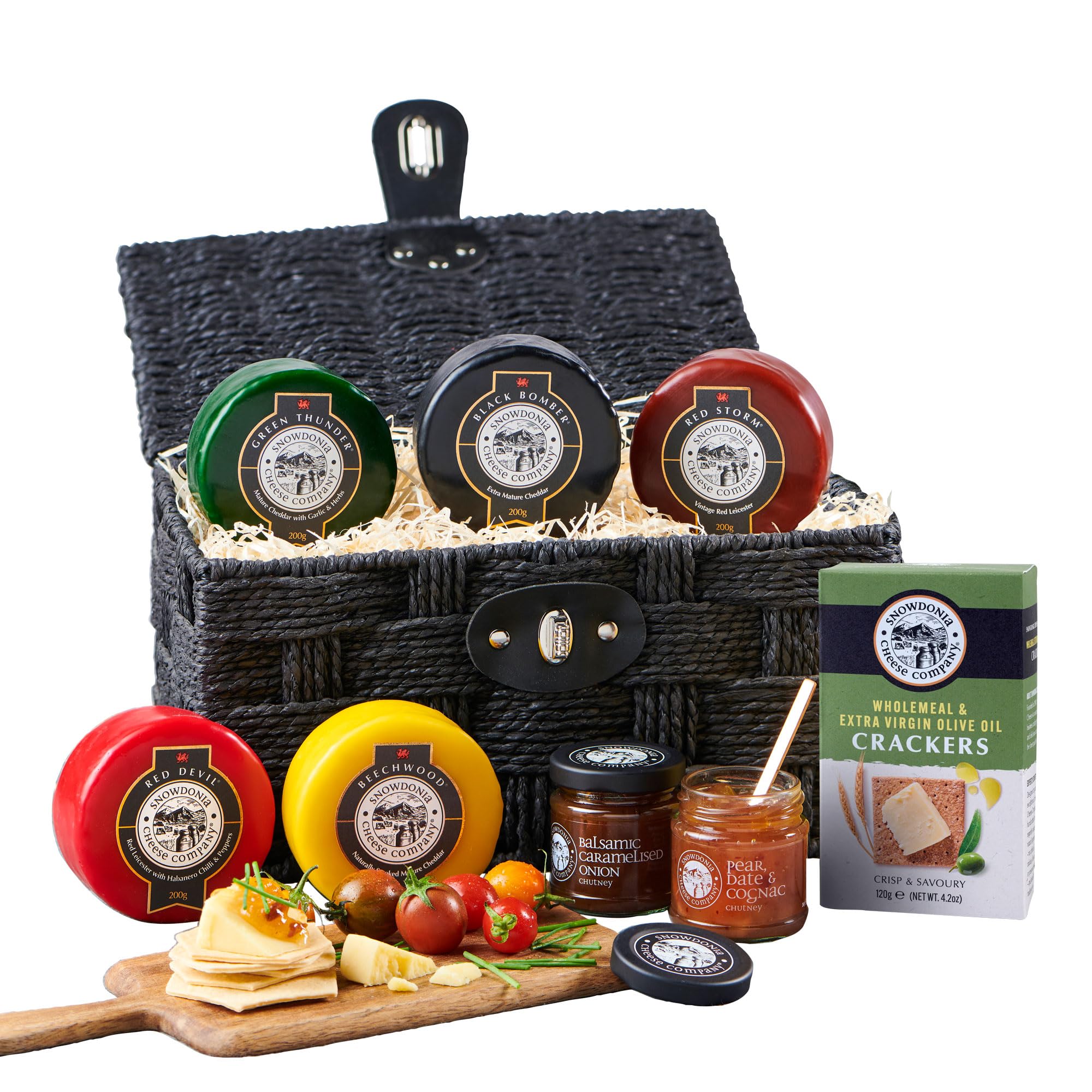 Open this stylish black paper rope hamper to discover a celebration of our most popular cheeses and chutneys. From our award-winning Black Bomber and Red Storm, to our naturally smoked Beechwood; Green Thunder with roasted garlic and garden herbs; and Red Devil red Leicester with Habanero chillies, peppers and spices, this is a wonderful introduction to our range - whether you’re buying it as a gift or for yourself. Carefully selected to complement the cheeses are a pair of our bestselling chutneys - Balsamic Caramelised Onion and Pear, Date & Cognac - plus a box of crunchy buttermilk crackers.