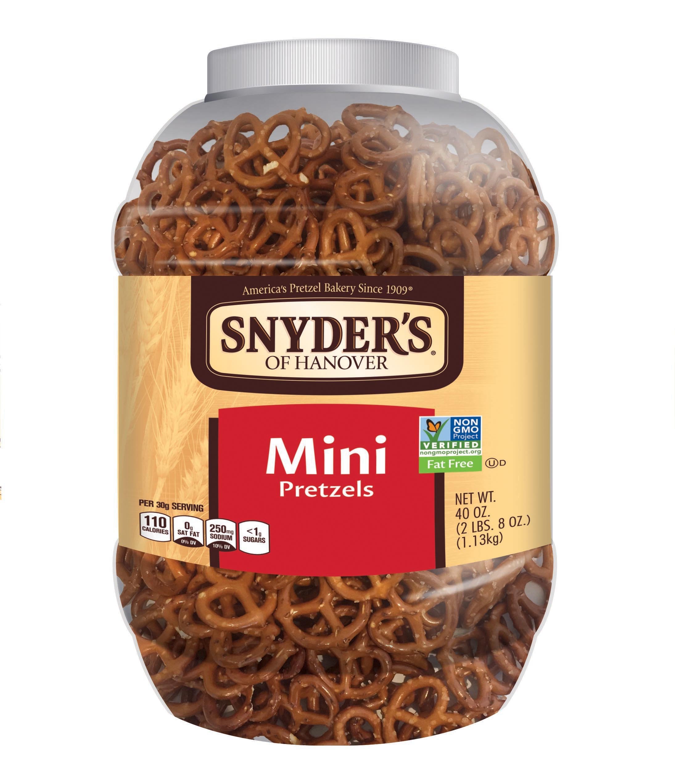 Snyder's of Hanover Mini Pretzels give you that delicious crunch for a perfectly sized snack. Our Mini Pretzels offer all the delicious flavor of traditional pretzels in a crunchy, bite-size snack. They're perfect for snacking at home or on-the-go! Made in a facility that does not process peanuts, they're the perfect school snack. Snyder's of Hanover has been America's Pretzel Bakery since 1909 and our pretzels give you that delicious crunch for the perfect snack! Non-GMO project verified and made in a facility that does not process peanuts, Snyder's of Hanover pretzels are made from wholesome ingredients, kneaded, and oven-baked to seal in all the flavor. Snyder's of Hanover pretzels have been shared across tables, across generations and across the country, making us America's favorite pretzel brand.