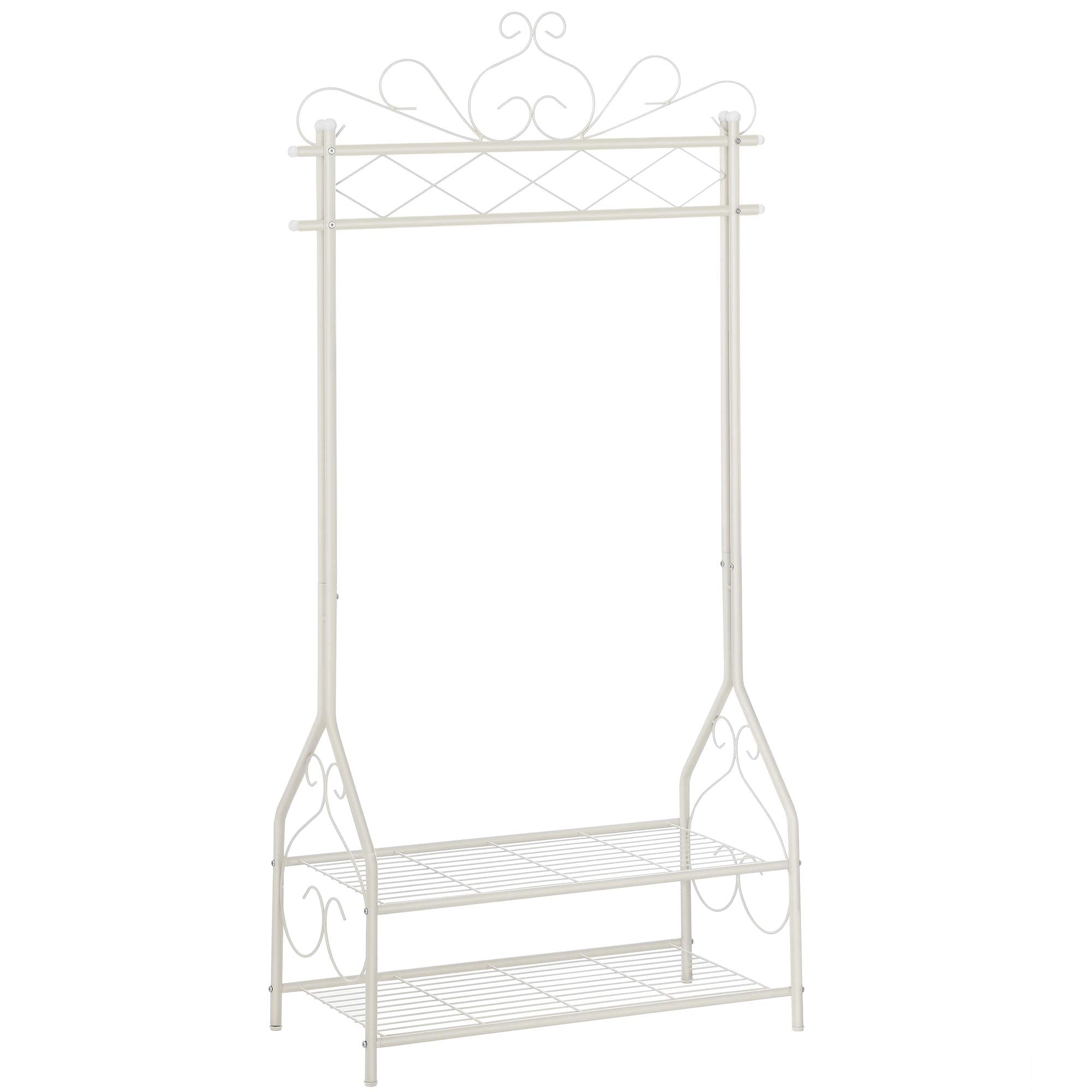 Descriptions: Do your jackets and coats get stacked up in the wardrobe? Are your shoes still scattered around the hallway? Here comes the solution!Vintage Style Look Curvy elements and metal frame are integrated in this vintage clothes stand, with our original design, it adds a nostalgic touch to your hallway, dressing room, bedroom, etc.Practical Function The upper clothes rail and the lower shelves offer plenty of space for clothes, hats, bags and shoes, so the coat stand brings order to your home. Whether for organising your closet or for the clothes display in a boutique, it is perfect. For a tidy home, you cannot miss SONGMICS clothes rack, it combines functionality and aesthetics ideally.Specifications: - Colour: Cream - Material: Powder Coated Steel Tubes - Product Size: 92 x 41 x 173 cm (W x D x H) - Single Shelf Size: 76 x 40 cm (W x D) - Product Weight: 5.6 kg - Load Capacity of Hanging Rail: 25 kg - Load Capacity of Single Shelf: 10 kgPackage Contents: - 1 x Clothes Rack - 1 x Instructions (EN, DE, FR, ES, IT)