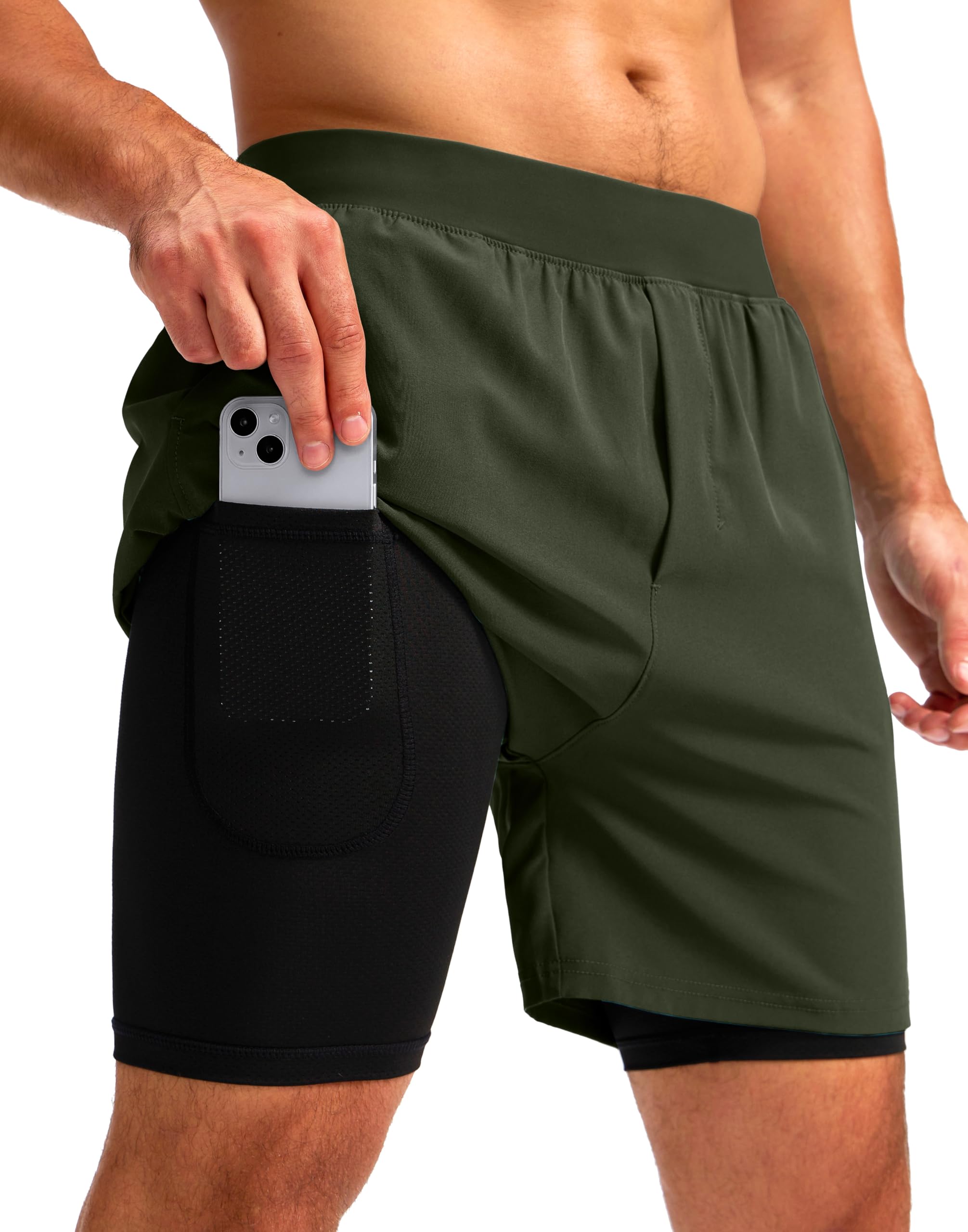 Soothfeel Men's 2 in 1 Running Shorts with 4 Pockets 5 Inch Quick Dry Gym Active Workout Athletic Shorts for Men with Liner(Army_Green&Black, L)