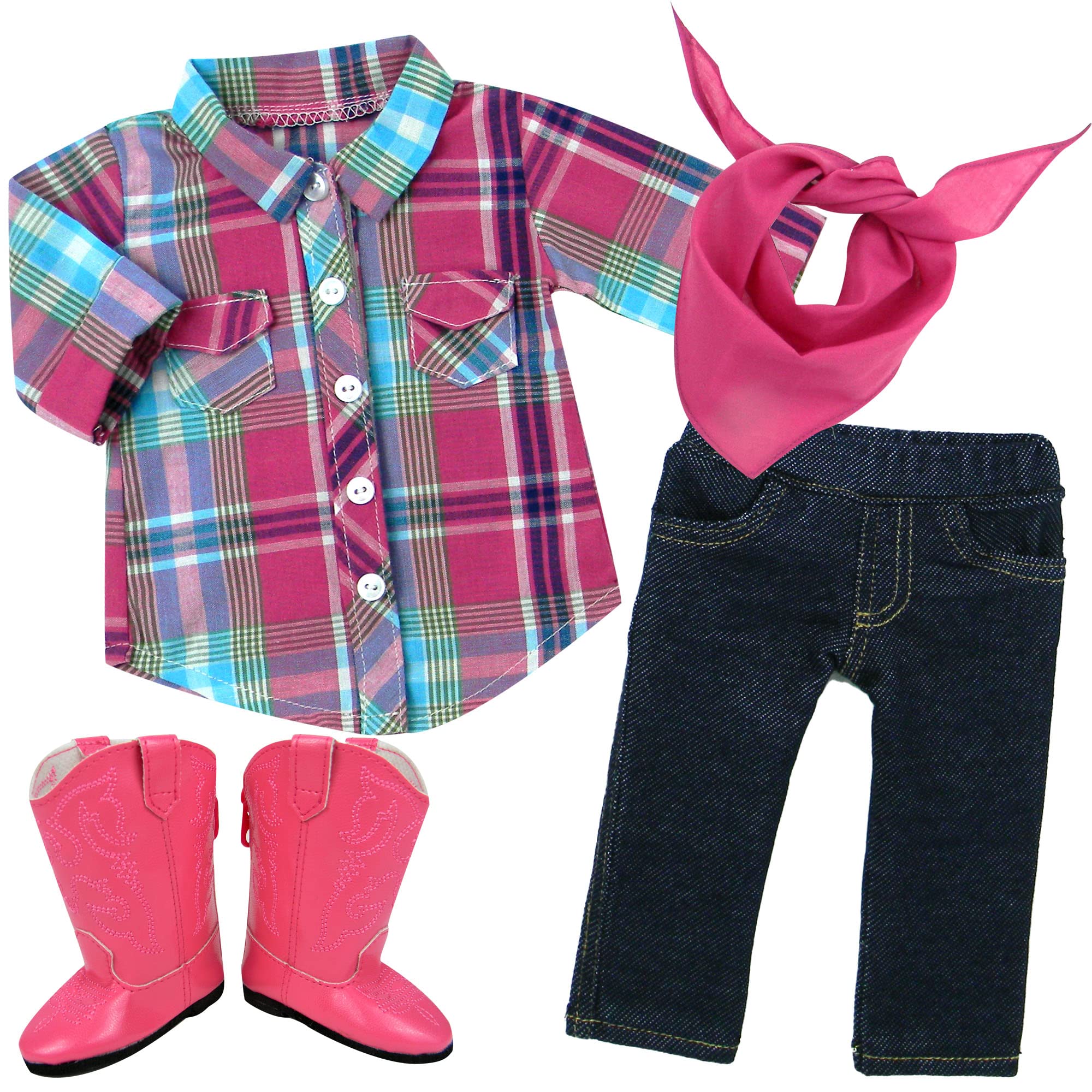 Western 4 Piece Set for 18 Inch Dolls. Set includes hot pink and teal plaid blouse, denim leggings, pink bandana and pink cutout cowgirl boots. Doll Not Included. 2016 Sophia's- All Rights Reserved. Not affiliated with American Girl, Reg. Trademark of American Girl, LLC.
