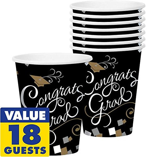 Take your party to the top of the class with our Sophisticated Grad Paper Cups. The classic black, gold, and silver color palette matches any graduation party theme, and the printed confetti pattern sets the tone for a celebration. These disposable paper cups make cleanup a breeze at your graduation party.