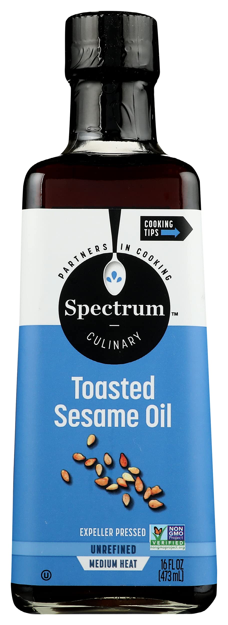 Spectrum brand Organic Unrefined Toasted Sesame Oil adds intense sesame flavor and aroma to Asian stir-fry recipes, as well as soba noodles, shrimp wontons with dipping sauce, and salad dressing for Chinese chicken salad.