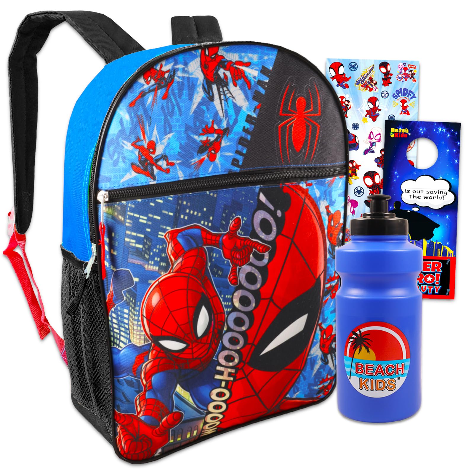 Spiderman Backpack for Boys Set - Bundle with Spiderman Backpack Plus Water Bottle, Stickers, More | Spiderman School Backpack for Kids. This Spiderman school bag bundle includes one 16" backpack with adjustable shoulder straps and zip closure main and front compartments. Backpack features colorful artwork of everyone's favorite web-slinging hero, Spiderman. Show off your love of Spiderman in style! This Spiderman backpack is sure to be a hit with Marvel fans of all ages and is perfect to take with you to school, on vacation, or anywhere else. This Spiderman backpack and travel set also includes Spiderman stickers, making a perfect gift set for your favorite Avengers or Spiderman fan. Officially licensed Marvel Spiderman backpack custom product bundle, perfect for Marvel fans of all ages. Set also includes a Beach Kids water bottle and a Beach Kids superhero door hanger.