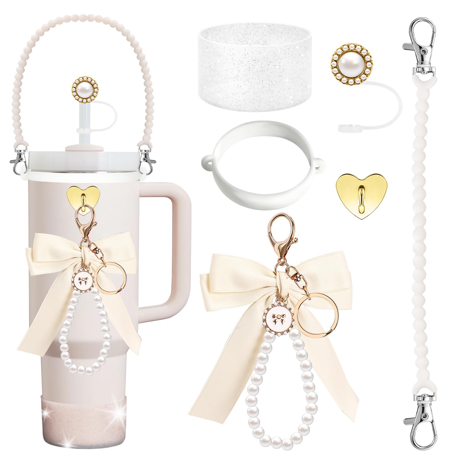 6 pcs Stanley Cup Accessories include Stanley Straw Covers Cap, Bow Pearl Keychain Charms, Water Bottle Bling and Stanley Boot to compatible with stanley tumbler 30 oz 40 oz
