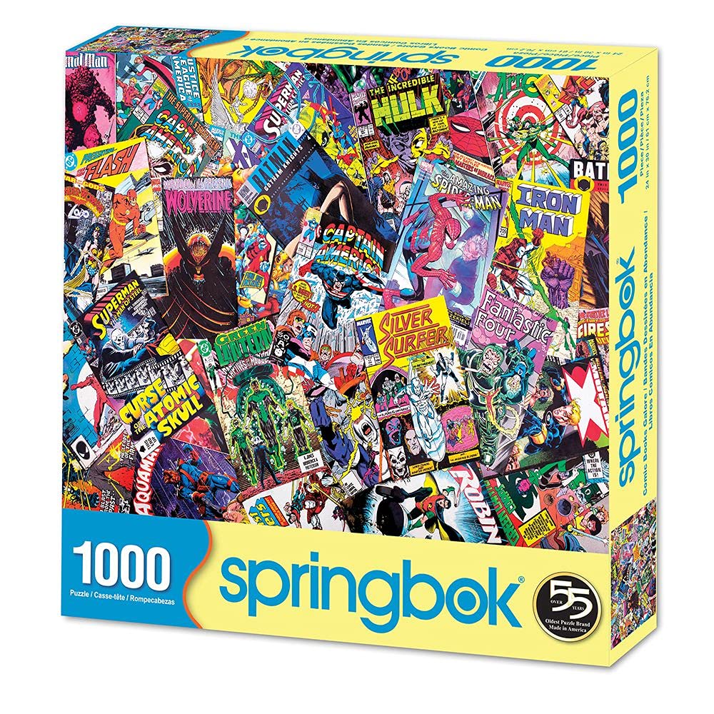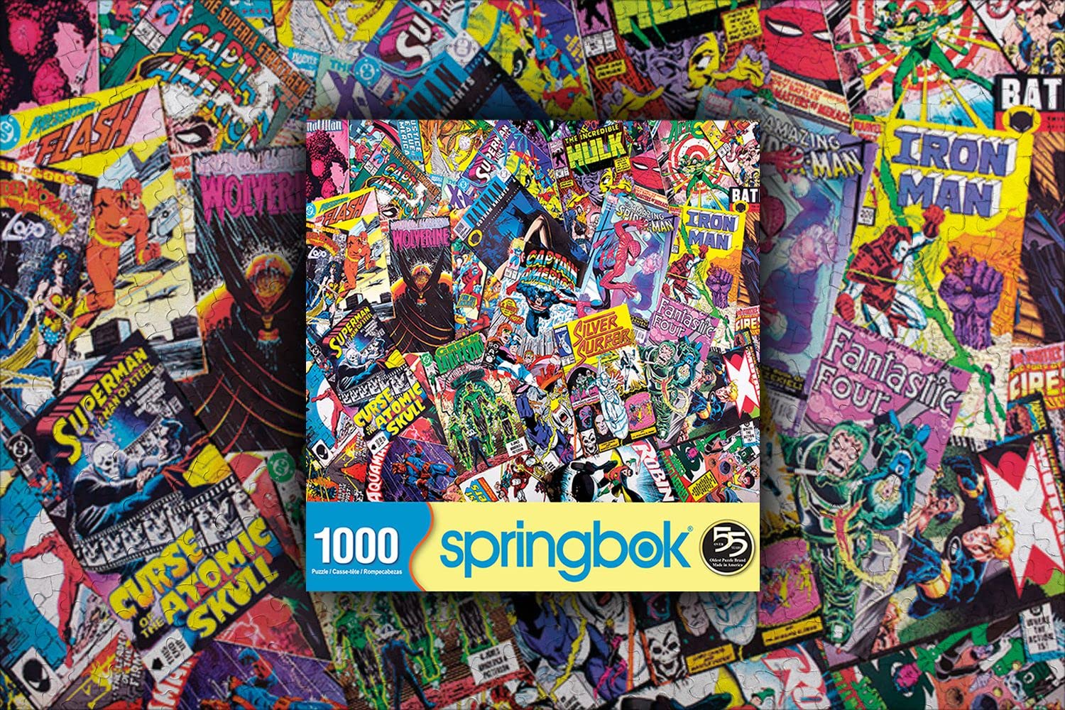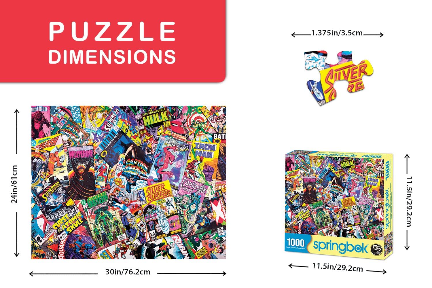Get ready to fight crime alongside your favorite heroes with "Comic Books Galore," the 1000 piece jigsaw puzzle from Springbok Puzzles. This nostalgic collage features titles from the classic gold & silver age of comic book covers. This amazing work of art was painted by a very talented artist that caught the eye of our Springbok creative department. The attention to detail, use of period correct color, and selection of titles truly created a special piece that we know puzzlers & comic book fans alike will proudly display in their homes. Exercise Memory - Jigsaw Puzzles sharpen cognitive function. Current neurology experts assert that puzzles stimulate neuroplasticity and can even slow progressive memory loss. Deepen Connections - Conversation flows naturally as your sort and interlock the design. It's like we always say: Love completes the puzzle. Relieve Stress - Escaping into the calm of puzzling for as little as 20 minutes can soothe anxieties. It's the perfect digital detox for you and your loved ones.