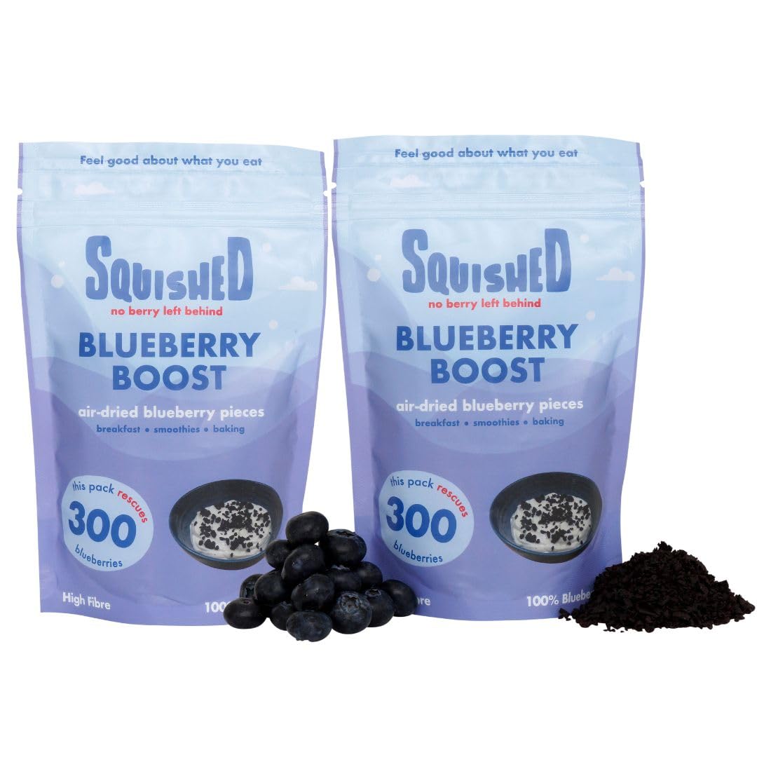 Squished blueberry pieces are made from 100% rescue blueberries - perfectly good fruit that is surplus to requirements. Nothing is added to the product which is air dried using pioneering processes. To produce 200g of intensely flavoured and nutrient dense blueberry pieces Squished rescues 1 kg of this superfood. Add to cereals, pancakes, smoothies and many other domestic baking products that would otherwise use freeze dried blueberries or powders.