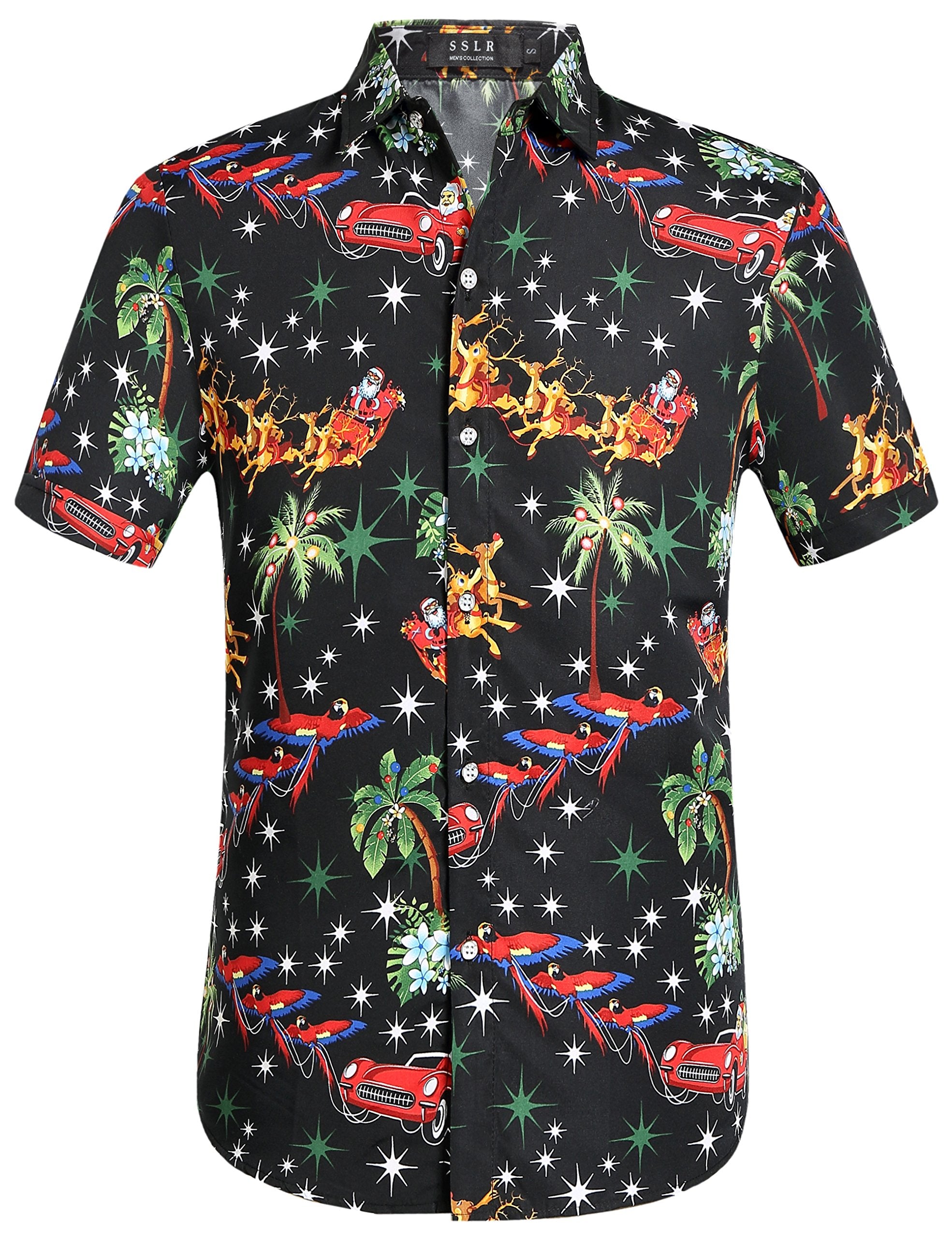 SSLR Men's Christmas Button Down Casual Short Sleeve Hawaiian Aloha Shirt (Large, Black)