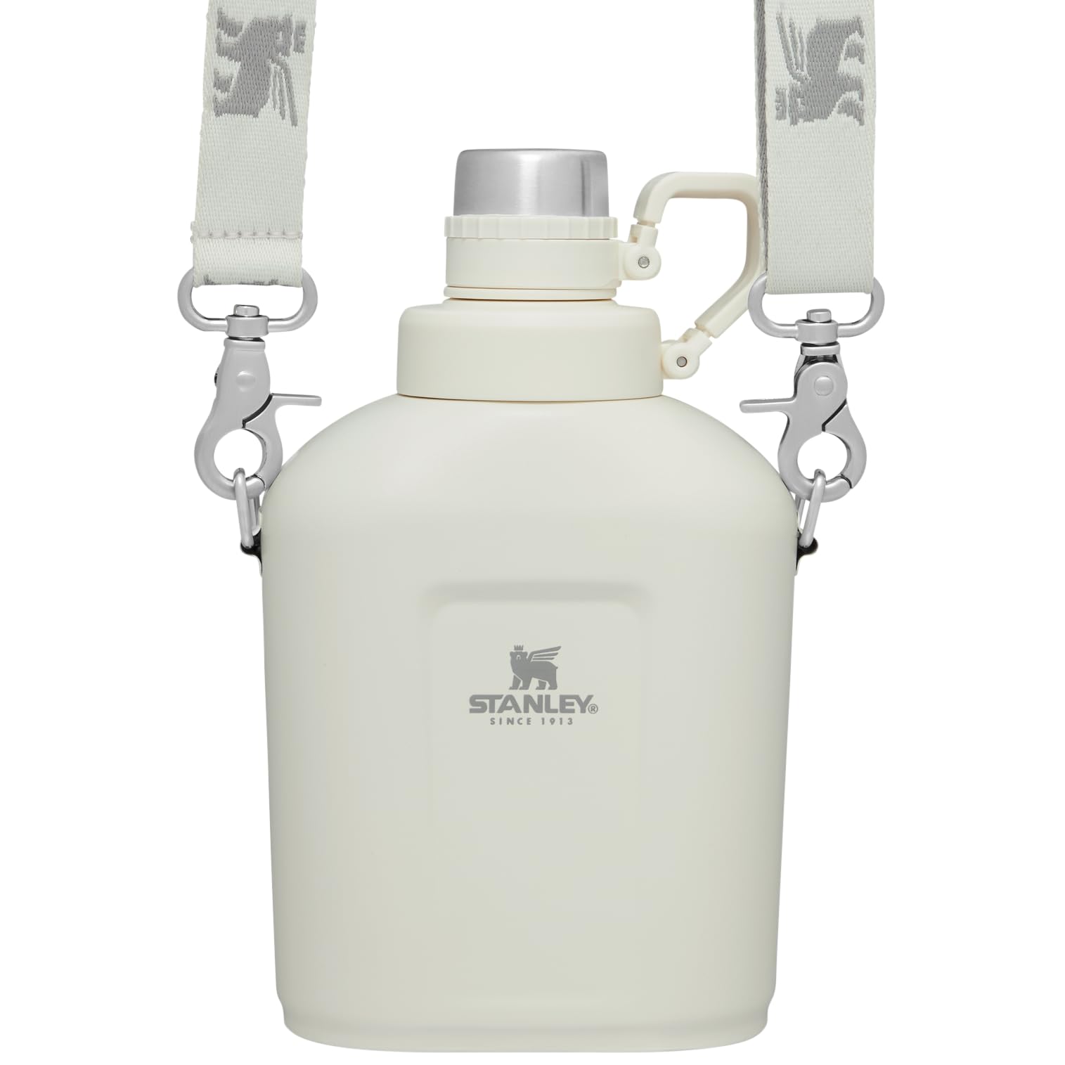 The Stanley Canteen is back and ready for your next urban hike or glamping getaway. Fill it with a quart of your favorite beverage - the stainless steel Canteen holds enough water for a day on the go, and it is the perfect size to slide it in your backpack or carryon, too. Sling it over your shoulder - this one is lightweight and keeps you hands-free until you need it, thanks to the removeable carry strap featuring our iconic winged bear. The cap is attached so it will never go missing, and with four colors to choose from you'll be on-trend but never thirsty.