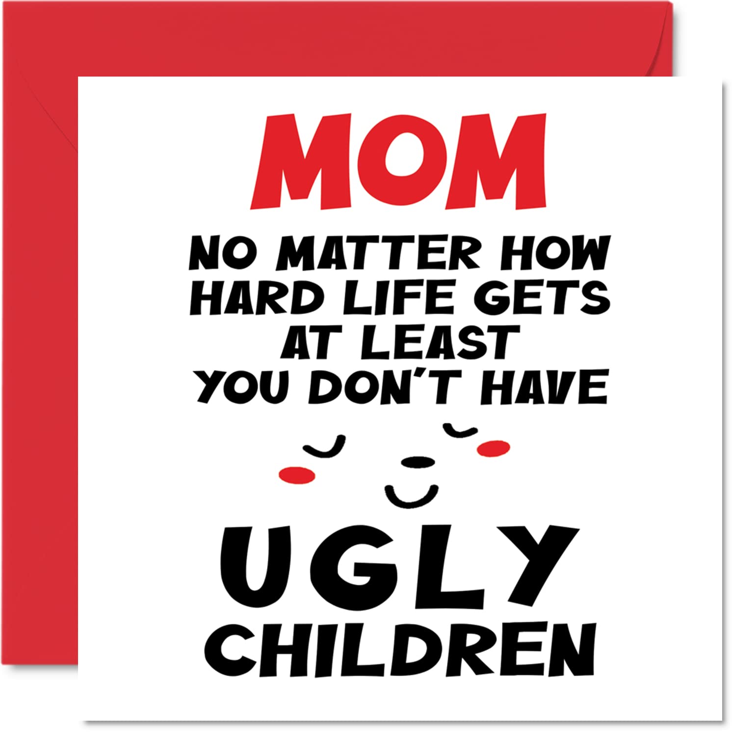 Life is better when you are smilingMake them smile when they open a carefully printed cute Mother's Day greeting card. A great, classic card shows the design saying: "Mom No Matter How Hard Life Gets At Least You Dont Have Ugly Children". They will read a second time for sure and then realise how fun and thoughtful this card is. If you are looking for Mothers Day cards for Mom then this Mom's Day card is bound to make them smile. This must be the best Mom birthday present for women on the marketplace and unlike other brands this is made in the UK. A sassy card for someone special.Have them remembering this year’s special day and they will think of you. Our cards are designed for all occasions such as Anniversaries, Birthdays, Christmas, Valentine’s Day or even a thoughtful gift for a work colleague. Funny birthday cards for women, leaving or retirement present, birthday card partner. Even a colleague’s good luck gift. Inspirational gifts for women and incredibly sweet cheer up positivity keepsake from Stuff4 Ltd.Every card is made from premium materials to ensure the highest standard of quality. Contemporary in style, we aim to offer quality gifts at an affordable price.Stuff4 has over 20 years’ experience in the printing industry so we know how to produce quality with a fast turnaround every time.