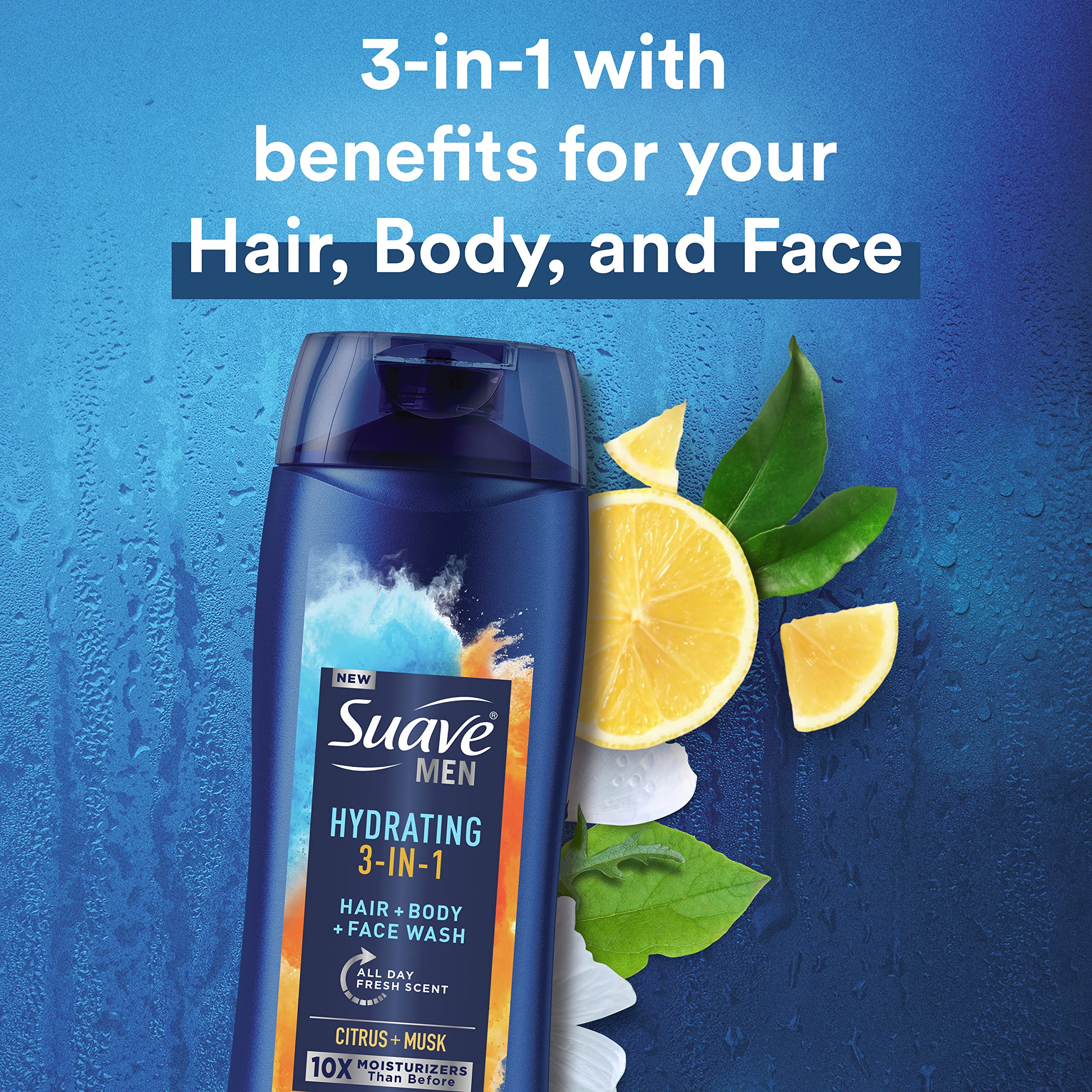 Works Hard, Smells Great! Get clean from head to toe and embrace an all day fresh scent with the Suave Men Hydrating 3 in 1 Hair, Body, and Face Wash. Made for men, this body soap is a mens body wash, face wash and mens shampoo that is formulated to hydrate and moisturize skin instantly, keeping your routine quick and easy. With 10x more moisturizers than before! Our 3 in 1 mens body wash and mens shampoo leaves you with an all day fresh scent of citrus and musk. This Mens 3 in 1 body wash, shampoo and face wash is formulated with our Suave Men Triple-Action Technology. This Triple Action Technology works to deeply clean, washing away sweat, oil and impurities, leaving skin feeling soft and smooth, while smelling fresh all day. The results: moisturized hair and hydrated skin that looks, feels and smells amazing. Directions: Lather this face and body cleanser. Wash. Rinse. Good for you and the planet! Suave Men Body Cleansers are made from 100 percent recycled plastic. Discover our entire collection of Suave Men body wash, deodorants, shampoos and conditioners for an entire skin care routine for men. At Suave, we have been helping America live beautifully since 1937. We believe everyone deserves access to beauty that sparks happiness for your hair, body, and soul. Since the 1940s, we have been developing safe, high-quality ingredients designed to bring joy to you and your entire family as you use them every day. Whatever you and your family’s personal care needs, you can have complete confidence that Suave products will help you boost your mind, body, and spirit while adhering to the highest global safety and quality standards.