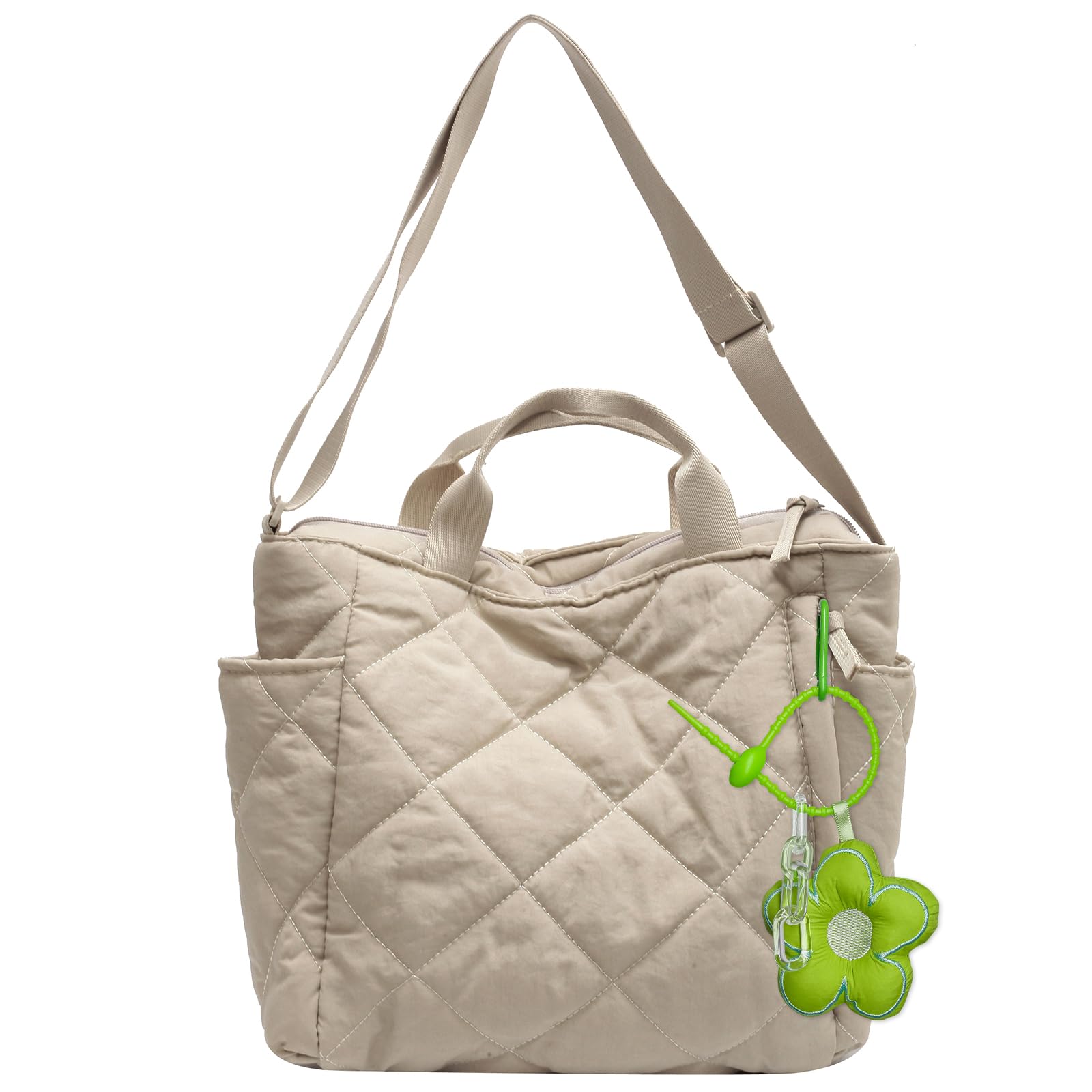 Puffer Tote Bag for Women - Sumeiwill Quilted Puffy Padded Purse Soft Handbag for Everyday Work Travel(with Flower Keychain)