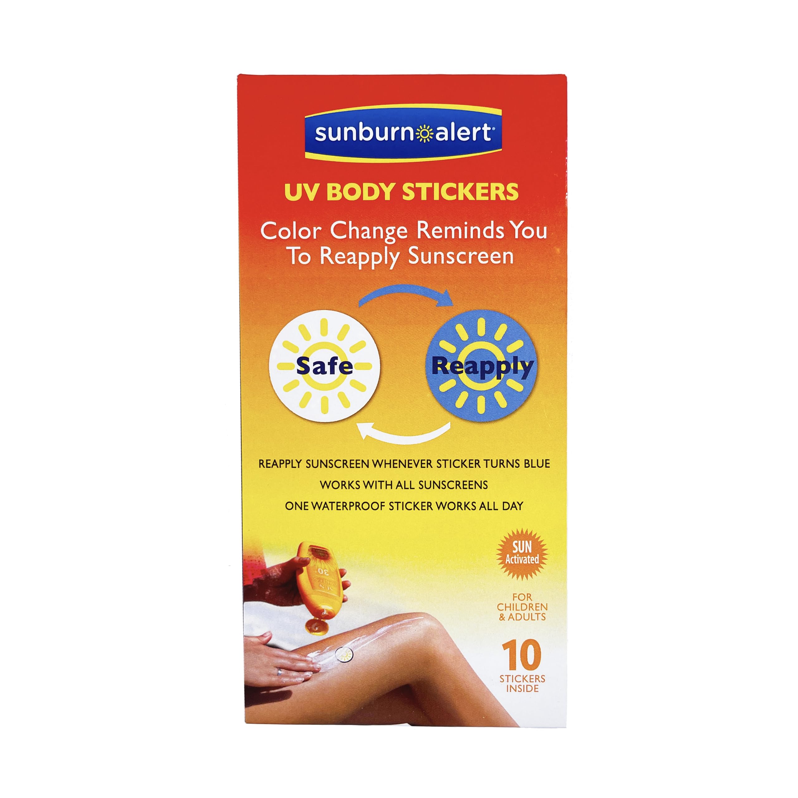 The perfect sticker for all skin types of any age. Color change reminds you to reapply sunscreen. Stickers will not leave tan lines if used properly. Apply sunscreen directly on the skin and the Body Sticker. When the Body Sticker begins turning blue, this is your reminder that your sunscreen is losing its Sun Protection Factor (SPF) and you need to reapply to the skin and sticker again. Gentle comfort fit with skin safe medical grade adhesive. Stays on skin all day, wet or dry.
