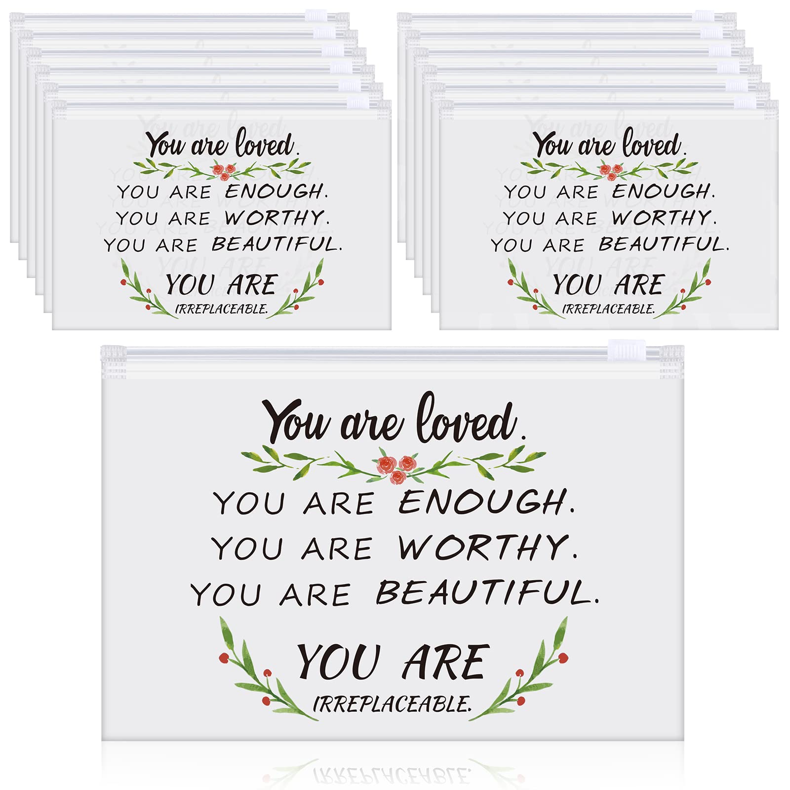 Features: Meaningful gifts: The inspirational zipper pouch is beautiful and eye catching, can be sent as a birthday gift to your daughter, sister, friend, wife or girls you care about, meeting their storage requirements and showing them your appreciation and encouragement. Make you happy: The inspirational gifts for women with clear appearance are simple and modern, can save your time and effort to find the items you need. Every time seeing the inspirational printing, you will have a positive attitude toward your life. Specifications: Material: EVAColor: as pictures showSize: about 7.87 x 5.91 inches/ 20 x 15 cmPackage includes: 60 x Inspirational cosmetic bagsNotes: Manual measurement, please allow slight errors on size. The color may exist a slight difference due to different screen displays.