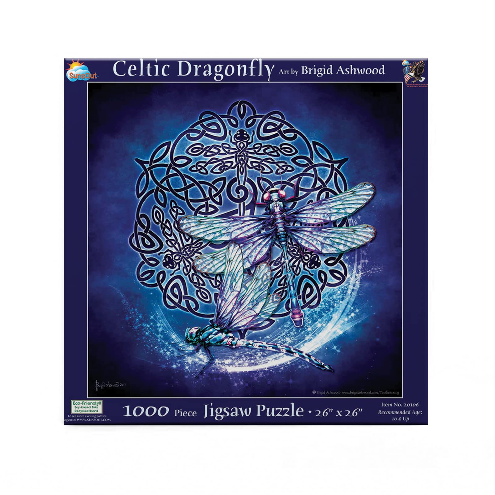 Celtic Dragonfly 1000 pc Jigsaw Puzzle by SunsOut - 1000 Piece Puzzle - Completed Size: 26x26 inches - Puzzle Artist: Brigid Ashwood - UPC: 796780201095 - Eco-Friendly - Soy-Based Inks - Recycled Board - Made in the USA - Interlocking Pieces & Durable Construction