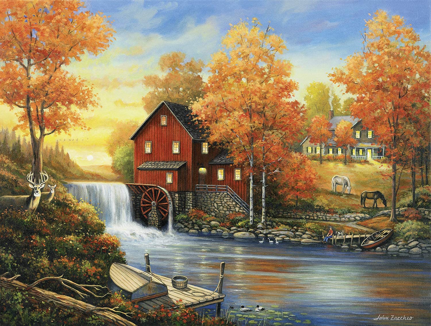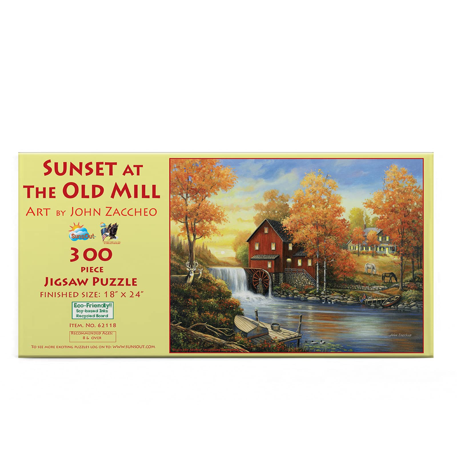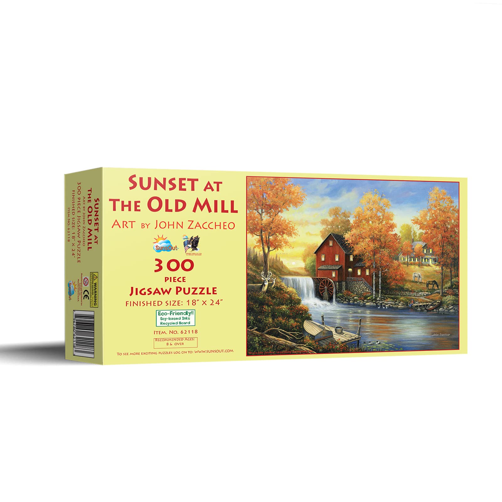 Sunset at the Old Mill 300 pc Jigsaw Puzzle by SUNSOUT INC - 300 pc Jigsaw Puzzle - Completed size: 18x24" - Puzzle Artist: John Zaccheo - Eco-Friendly - Soy-Based Inks - Recycled Board - Made in the USA - Interlocking Pieces & Durable Construction