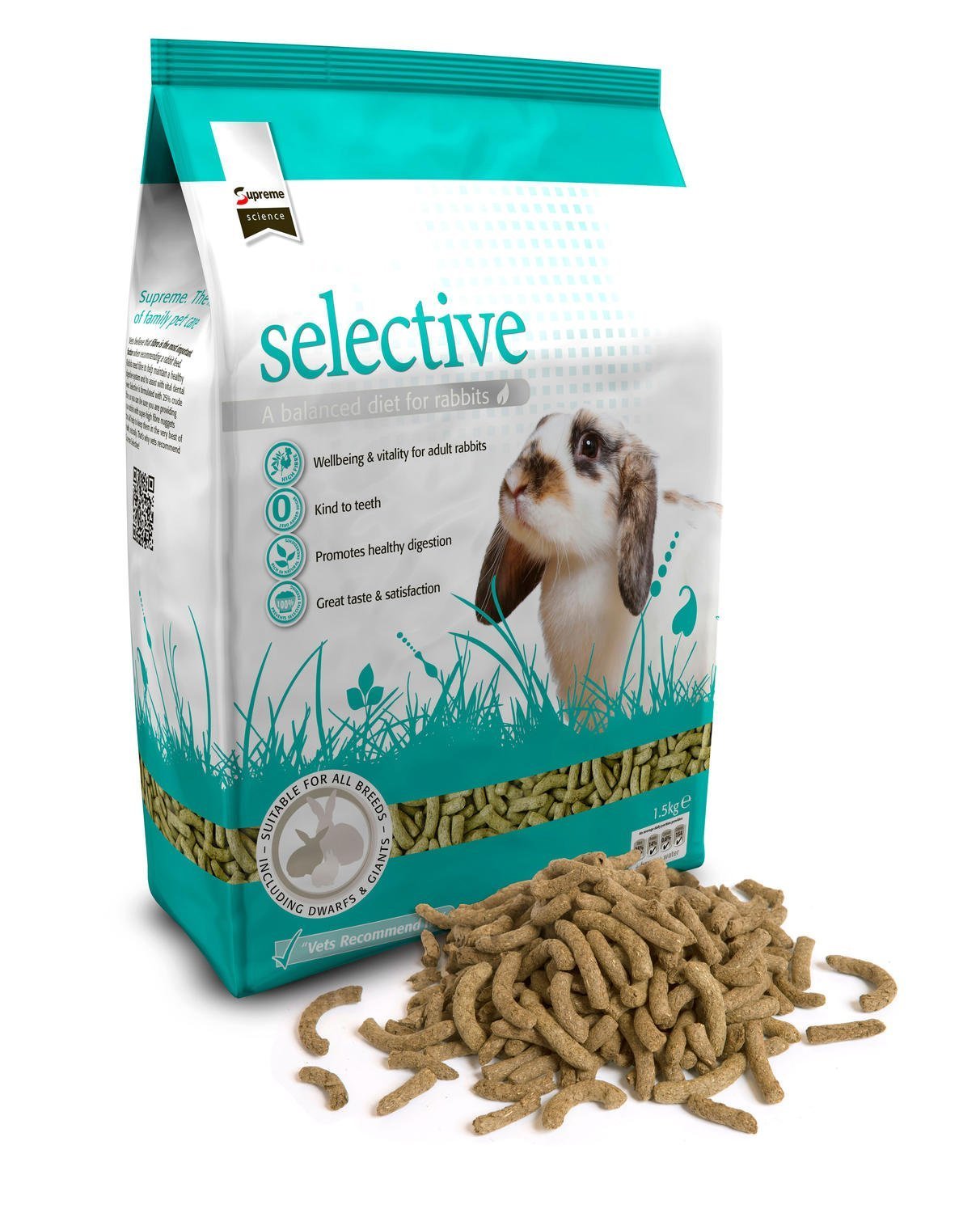 Product DescriptionSize Name:1.5kg Product Description Wild rabbits mainly eat grass which naturally contains 20-25 per cent fibre and rabbits' teeth, digestive systems have evolved to need a high fibre diet. Supreme Science Selective has 25 per cent fibre so you can provide your rabbits with a high fibre, tasty diet that will help to keep your pets healthy. Selective contains forage as the main source of fibre and lots of other tasty, natural ingredients like linseed with Omega 3 and 6 that help to keep your rabbit’s skin and coat healthy. Ingredients All-Natural Directions 0 Box Contains 1 x 1.5 kg pack See more.IngredientsAll-NaturalDirections0Box Contains1 x 1.5 kg pack