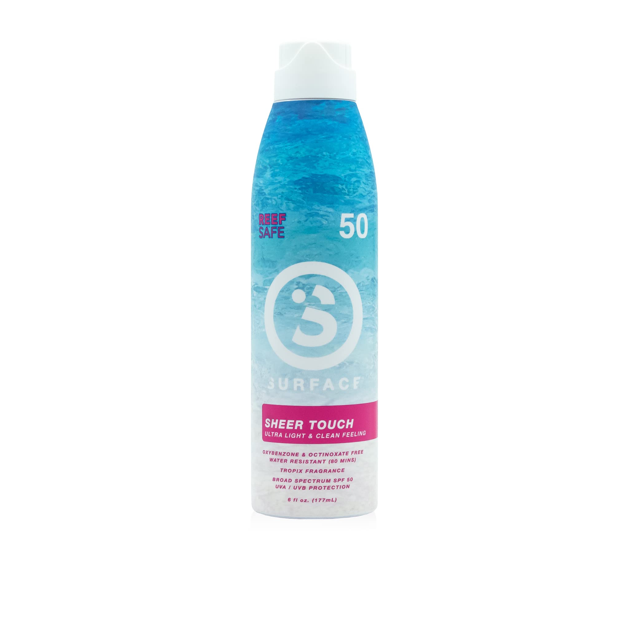 Surface bridges the gap between ultimate sun protection and ultimate sunscreen comfort. No more pasty, oily feeling sunscreen. All Surface sunscreens are developed using the highest quality ingredients to better protect you from the everyday harsh elements of the sun, while providing the most comfortable feel, letting you stay protected all day, every day! A wonderfully light and clean feeling, premium sunscreen Spray. The Surface Sheer Touch SPF50 Spray is made of the finest ingredients. Providing you a healthy, Reef Safe, and Broad-spectrum UVA/UVB shield from the sun. While the Tropix fragrance made of Coconut, Mango and Guava will have you dreaming you were there.