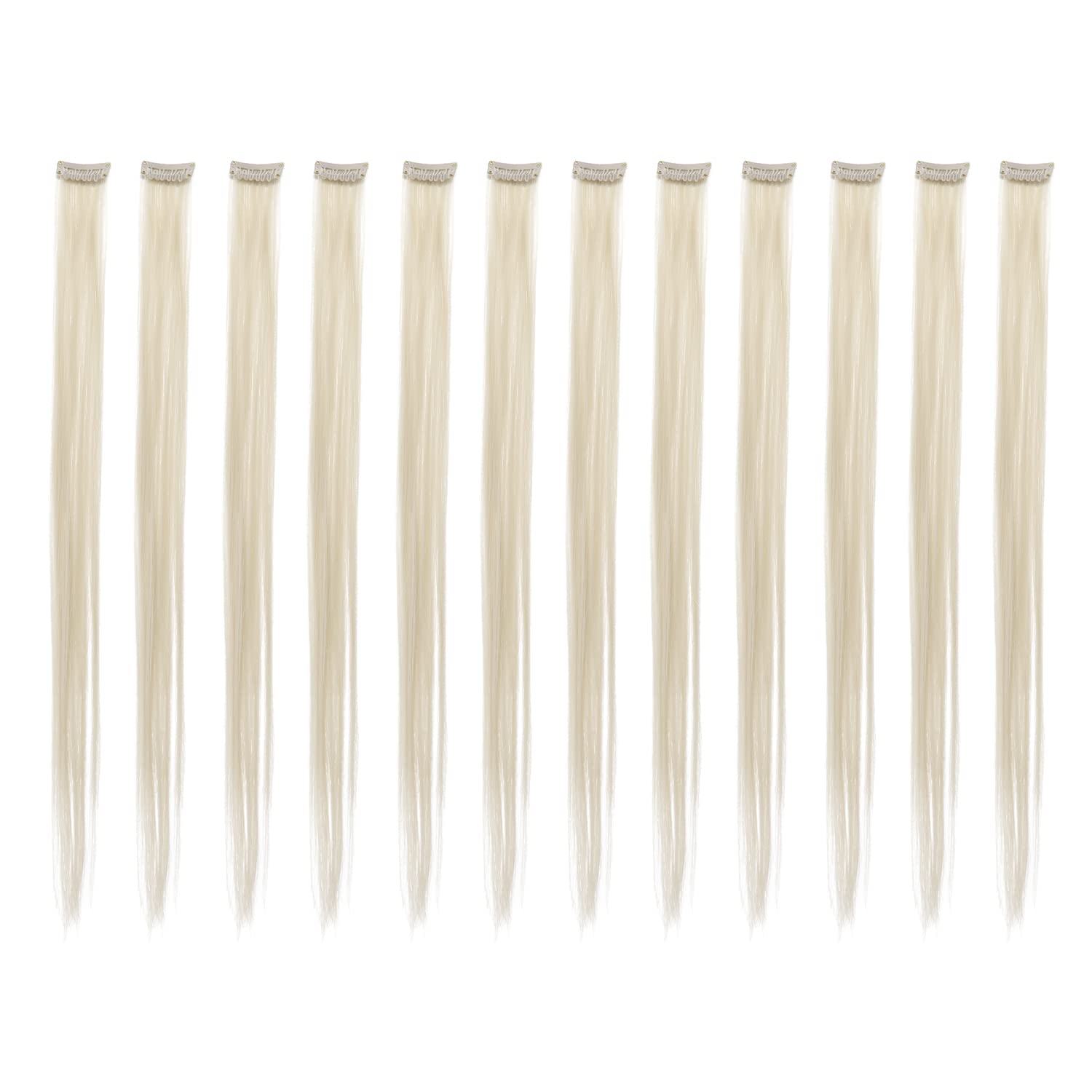 SWACC 12 Pcs Straight One Color Party Highlights Clip on in Hair Extensions Colored Hair Streak Synthetic Hairpieces (Platinum Blonde)