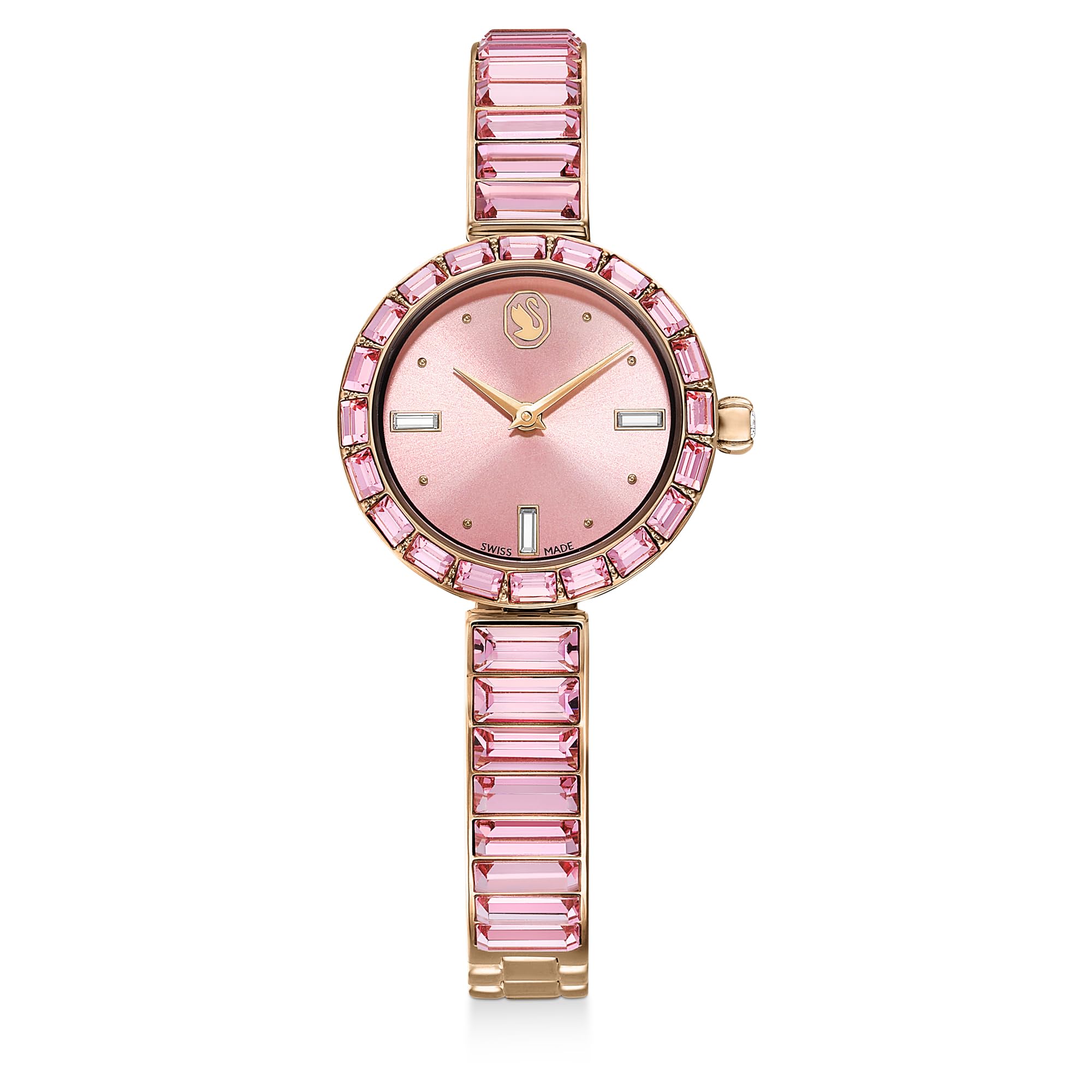 This Swarovski Matrix Bangle 5679890 women's oriented Swarovski watch , this stainless steel design has a rose gold-tone finish and is surrounded by a bezel with 20 pink crystals, while a single crystal is set inside the crown. The crystals also highlight three index markers on the pink dial, which also features a swan logo at 12 o'clock. Around the wrist, the bracelet-style strap is adorned with 16 crystals and is fully adjustable for a comfortable fit. Swiss Made. Functions: Two hands. Size: 25 mm. Water Resistance: 5 ATM. Three year warranty. Enjoy your Swarovski watch.