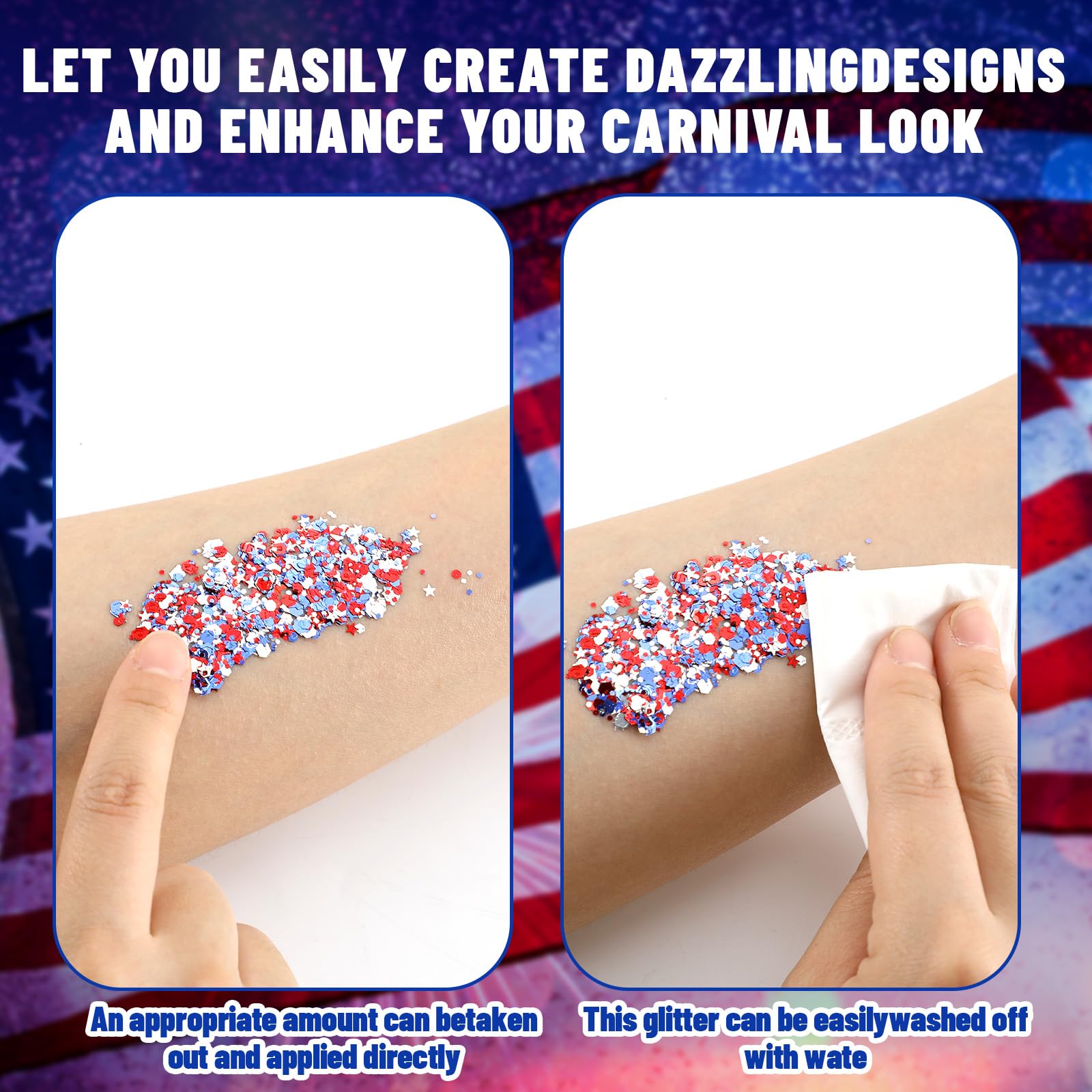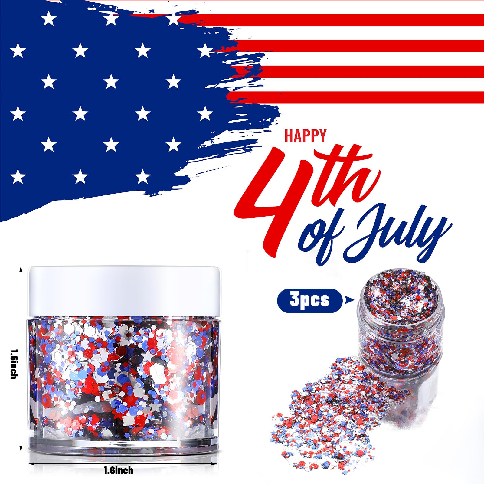 Swiffen 3 Pcs Independence Day Face Glitter Chunky Glitter with Gel Patriotic Memorial Day Body Glitter 4th of July Accessories for Women Face Paint Makeup Decorations(Red, White, Blue)