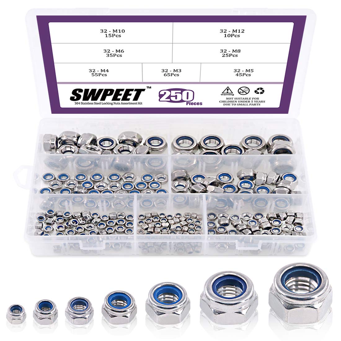 Swpeet 250Pcs 304 Stainless Steel Metric Lock Nut Assortment Kit Perfect for Lock Washers, Nylon Insert Locknut M3 M4 M5 M6 M8 M10 M12