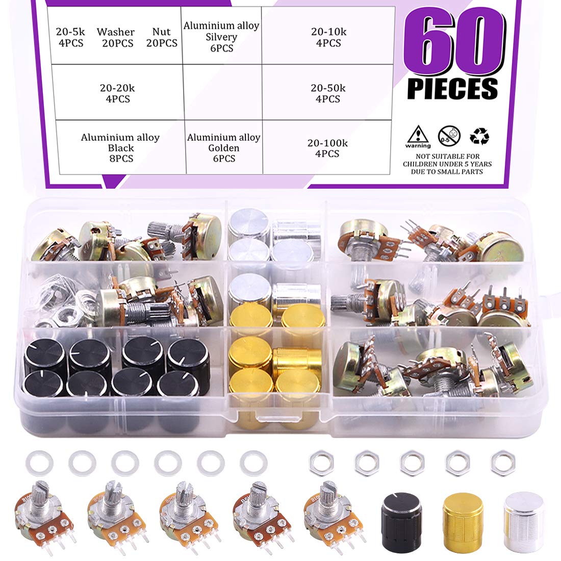 Swpeet 60PCS B5K 10K 20K 50K 100K Ohm Knurled Shaft Linear Rotary Taper Potentiometer with 20Pcs 3 Different Kinds Aluminum alloy Knob(WH148) and 40Pcs Washers and Nuts Kit for Tinkering
