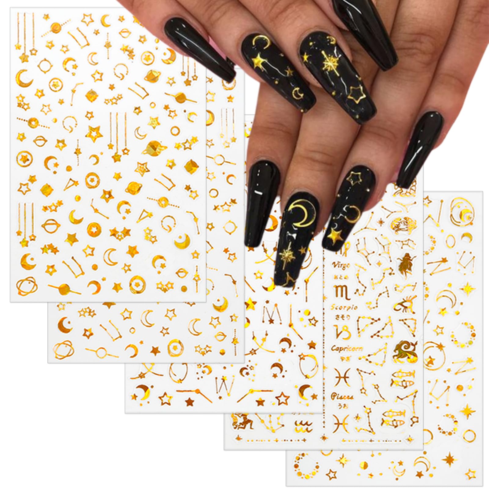 TailaiMei 12 Sheets Gold Moon Star Nail Stickers, 3D Metallic Laser Self-Adhesive Nail Art Decals for Women Manicure DIY or Nail Salon(1000Pcs)