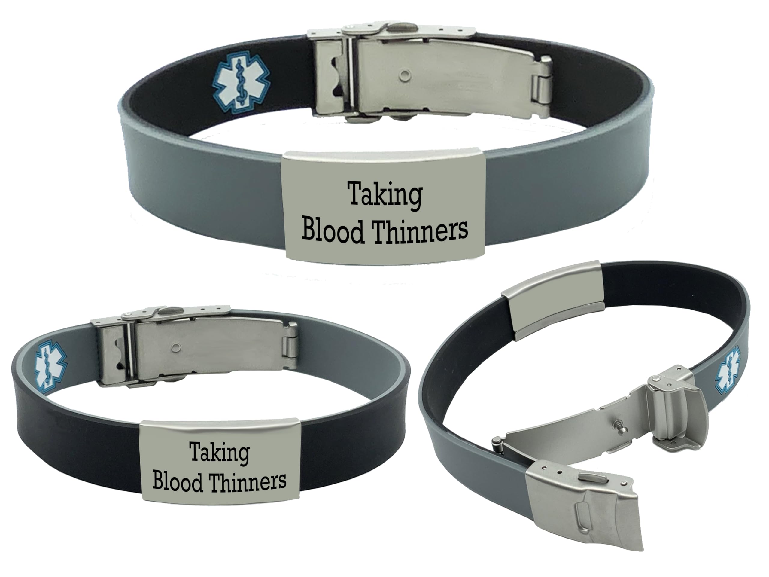 Introducing the fully waterproof TAKING BLOOD THINNERS SPORT/SLIM – Reversible Medical Alert ID Bracelet! Your pre-engraved message will be attention-getting in any emergency with the use of our bold high contrast black lettering on the matte finished engraving plate. The embossed Star of Life medical alert symbol is easily recognized world-wide advising of an existing medical condition. At just a “SLIM” 14mm wide this bracelet is designed to be cut to lengths between 5.75 and 8.5 inches.