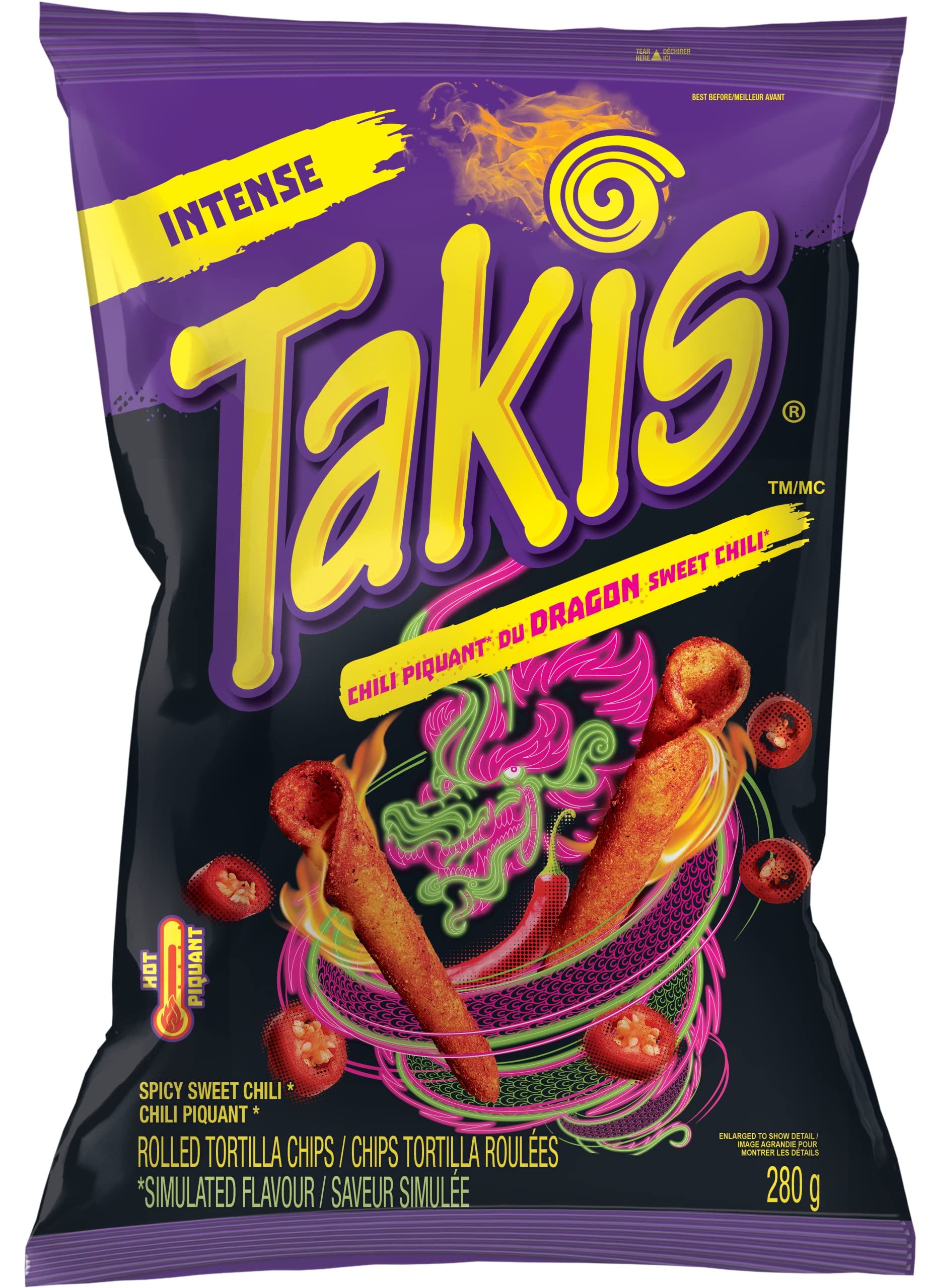 Takis Dragon Sweet Chili Rolled Tortilla Chips, 280g/9.8 oz., Bag. Conquer the DRAGON and claim its sweet and spicy riches with every satisfyingly crunchy bite! Experience a multitude of different flavors that explode in each bite of Takis Dragon Rolled tortilla Chips: Spicy, Sweet, Chili, Pepper and Lime Flavor (280g). Each crunchy piece of rolled Tortilla chips delivers a blast of spicy sweet chili pepper. These taste-bud tingling spicy tortilla chips are sure to thrill chip lovers looking for something beyond the ordinary. But beware, once you try Takis you might not be able to stop, only eat them if you dare. Simulated flavor.