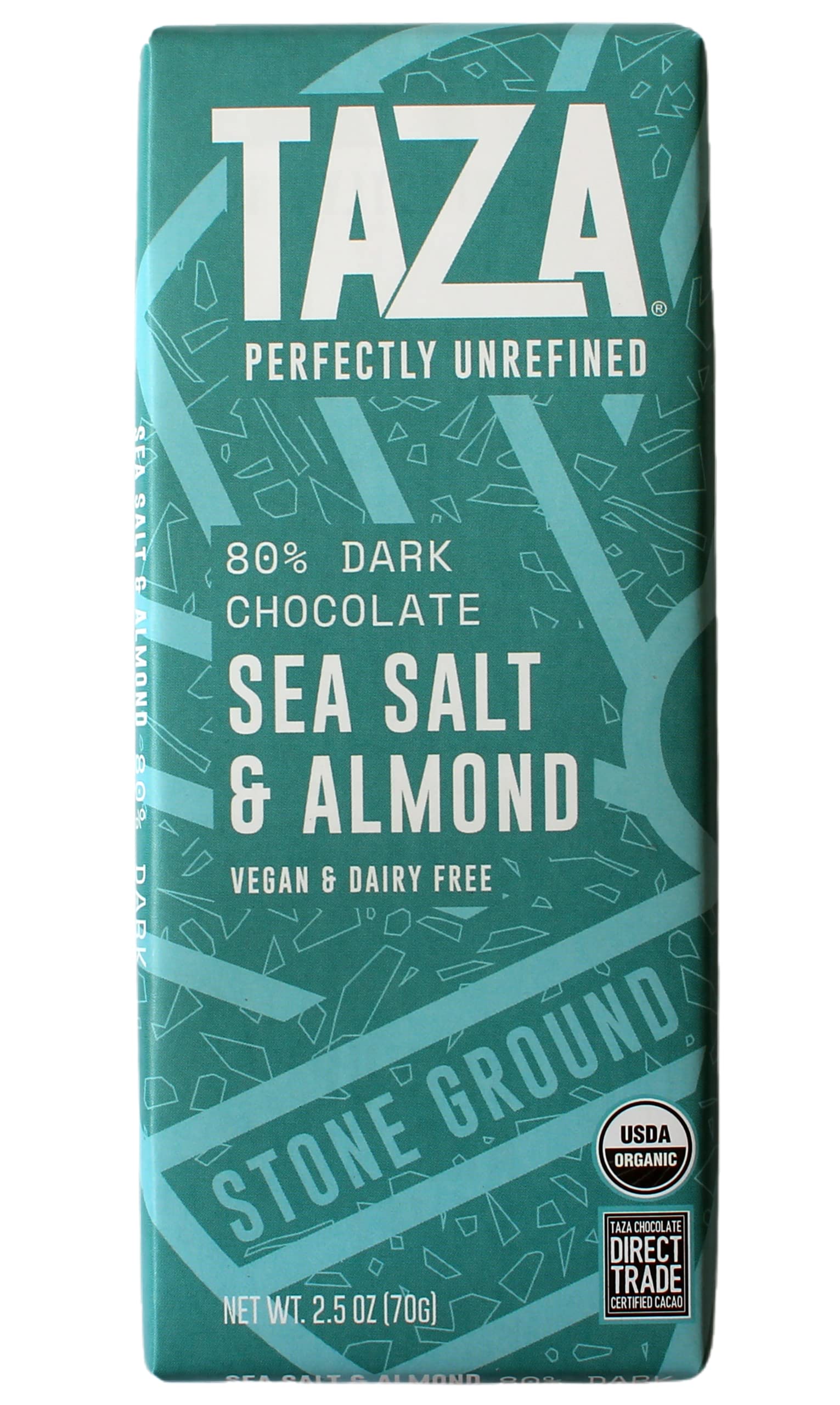 The Taza Sea Salt & Almond Amaze Bar combines perfectly unrefined 80% dark stone ground organic chocolate with a crave-worthy combo of freshly roasted almonds and a sprinkle of sea salt. Our stone ground chocolate is less processed, so the texture is satisfyingly gritty. This unique 80% dark chocolate makes a delicious, healthy treat or snack for chocolate lovers who want to eat low-sugar, low-carb, or Paleo. It has just 7 grams of sugar and 4 grams of protein per serving! At Taza, we stone grind our chocolate, inspired by Mexican chocolate traditions. We think chocolate should capture the bold flavors and textures of the best cacao, not process them out. We think our bars should let incredible ingredients shine, not cover up mediocre ones. We think our organic, Direct Trade Certified cacao should shout loud and proud in every delicious bite. Experience chocolate with true grit! Handcrafted in our Somerville, MA chocolate factory, all Taza Chocolate is Certified USDA Organic, Non-GMO Project Verified, Certified Gluten-Free, Dairy-Free, Soy-Free, Kosher, and Vegan. Our healthy dark chocolate makes a perfect gift, since even chocolate lovers with dietary restrictions can enjoy it.