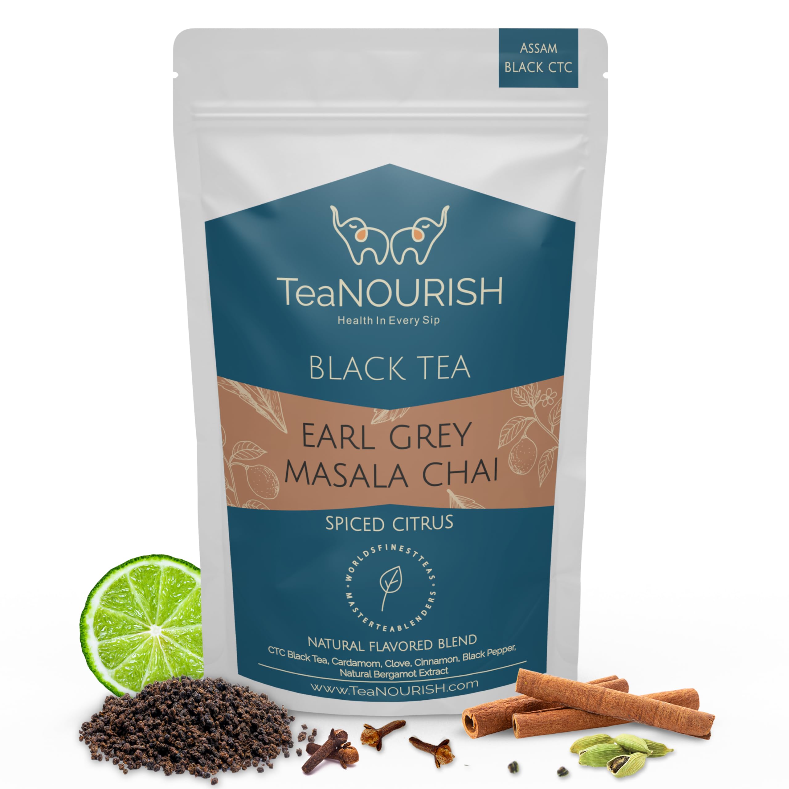 EARL GREY MASALA CHAI TEA : Adding a citrusy twist of bergamot to our age old Masala Chai, that is a blend of strong Assam CTC Black tea and Indian spices that are proven to have health benefits, this will brew a strong citrus, floral cup that will leave your asking for more. Enjoy it with or without milk, Hot or as Iced tea. INGREDIENTS : Assam Black Tea CTC, Cardamom, Clove, Cinnamon, Black Pepper enriched with Natural Bergamot extract OUR MOTTO : We are a young and enthusiastic tea brand with a motto of health in every sip. Our teas are all natural without any artificial colors or additives.WORLD'S FINEST TEAS : We source our teas direct from India’s world renowned plantations known for their quality and authentic taste. TEA BLENDS : Our master tea blenders have curated some of the unique tea blends infused with powerful herbs, which are not only great on taste but are also nourishing for mind, body and soul. BREWING GUIDE : Put one teaspoon (2gms) per cup, pour hot water (200ml), steep it for 3-5 mins, your cup of hot nourishing black tea is ready. Best enjoyed as black liquor tea but you can add milk and sugar to your taste.