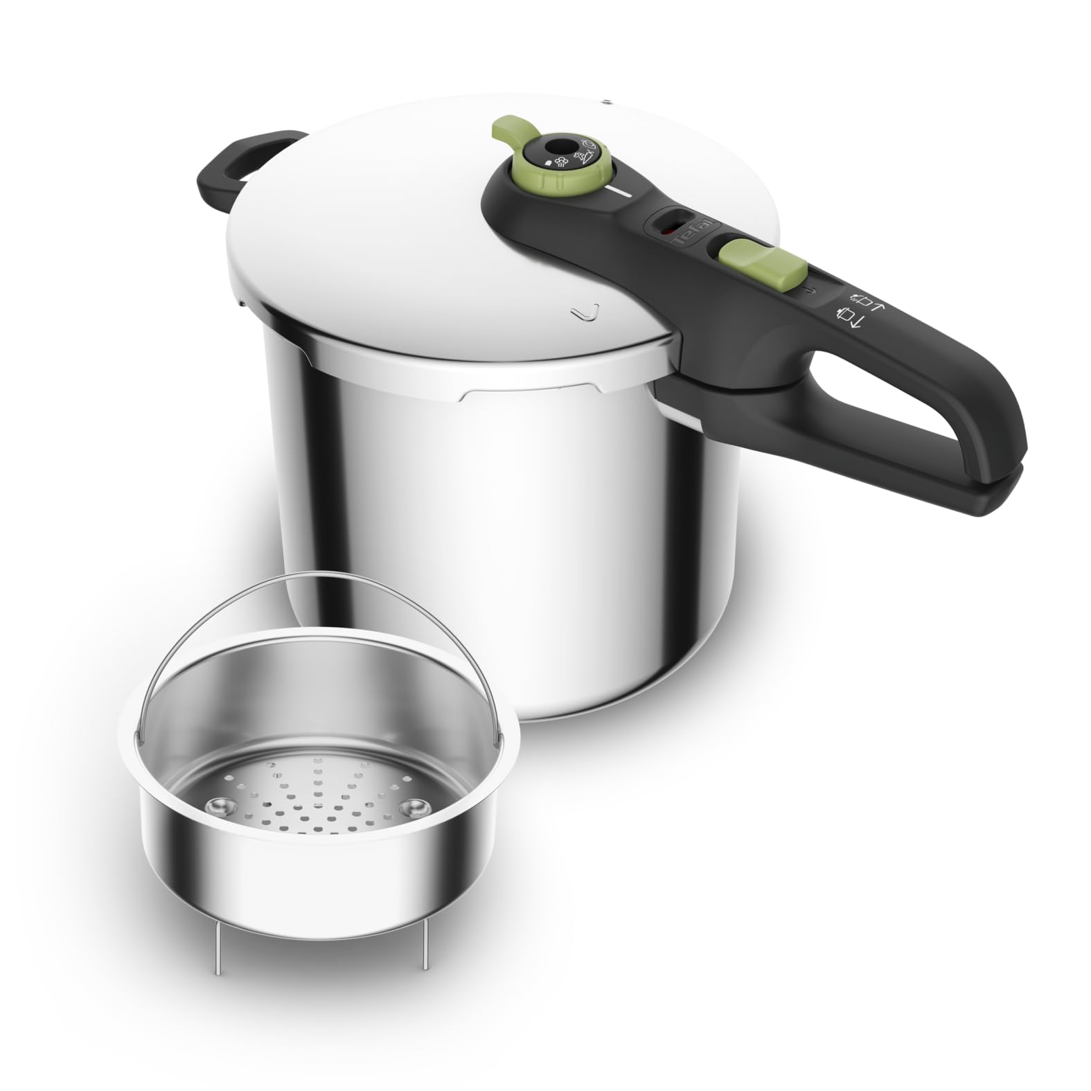 So fast, so delicious, so easy! Enjoy every type of meal and cook everything from vegetables to meat to fish. The Secure Trendy pressure cooker from Tefal has a 5-step safety system for safely opening, closing and releasing the pressure. 3 for protection against overpressure (safety valve, pressure valve, safety seal) and 2 other safety devices for opening/closing (safety lock, lid cannot be opened under pressure). The potato does not get cooked and the meat is not tender. Who doesn't know this problem. However, there is a simple solution, the pressure cooker. The Secure Trendy is perfect for a wide range of preparations: cooking, steaming, searing and stewing - all no problem for this pressure cooker. It also allows energy-saving and fast cooking with up to 2x faster results (compared to a conventional Tefal cooking pot). Another convincing feature is the gentle preparation for particularly healthy cooking. Up to 80 percent more nutrients are retained.