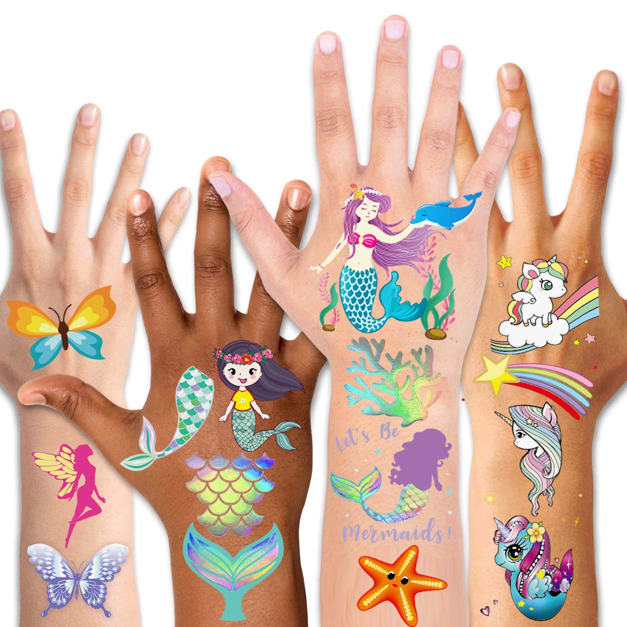 Temporary Tattoos for Kids(80pcs),Konsait Glitter Mermaid Butterfly Tattoos for Children Girls Birthday Party Favors Supplies Great Kids Party Accessories Goodie Bag Stuffers Party Fillers