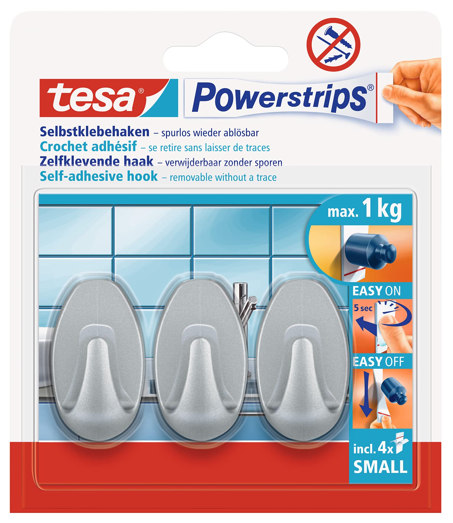tesa Powerstrips Hooks Small OVAL The adhesive hanging hook from tesa enables objects weighing up to 1 kg to be easily and securely fastened to smooth and stable surfaces. An ideal alternative to screws and other conventional hanging methods, the adhesive hook is particularly suitable for use on surfaces such as tiles or glass - making it ideal for bathrooms and kitchens. The Powerstrips are completely covered by the hook for a clean application. Both the uncomplicated installation and the non-marking removal make this practical multi-purpose oval hook a particularly smart fastening solution. tesa Powerstrips adhesive technology: the hanging solution of modern generations The innovative strips with double-sided bonding power offer fast and easy hanging solutions, drill-free and damage-free, for your home. Product features: ? High-quality plastic hooks for glass, tiles, wood, plastic and other surfaces ? Self-adhesive and can be applied without tools ? Hold up to 1 kg ? Easily removable without residues ? Hooks are reusable with new tesa Powerstrips SMALL Specifications of the product: Scope of delivery: 1 x tesa Powerstrips Hooks Small OVAL, consisting of 3 hooks and 4 tesa Powerstrips SMALL Load capacity: 1 kg per hook Colour: matt-chrome tesa - more than adhesive tape tesa is one of the world's leading manufacturers of adhesive tapes and adhesive system solutions and stands for innovative, high-quality products. For more than 125 years, the German company has been developing solutions for a wide variety of applications in the office, home, and garden, as well as for the automotive and electronics industries. tesa offers private households several hundred solutions for innovative fastening, assembly, packaging, renovation, repair, insulation, and protection against insects, dust, and draughts.