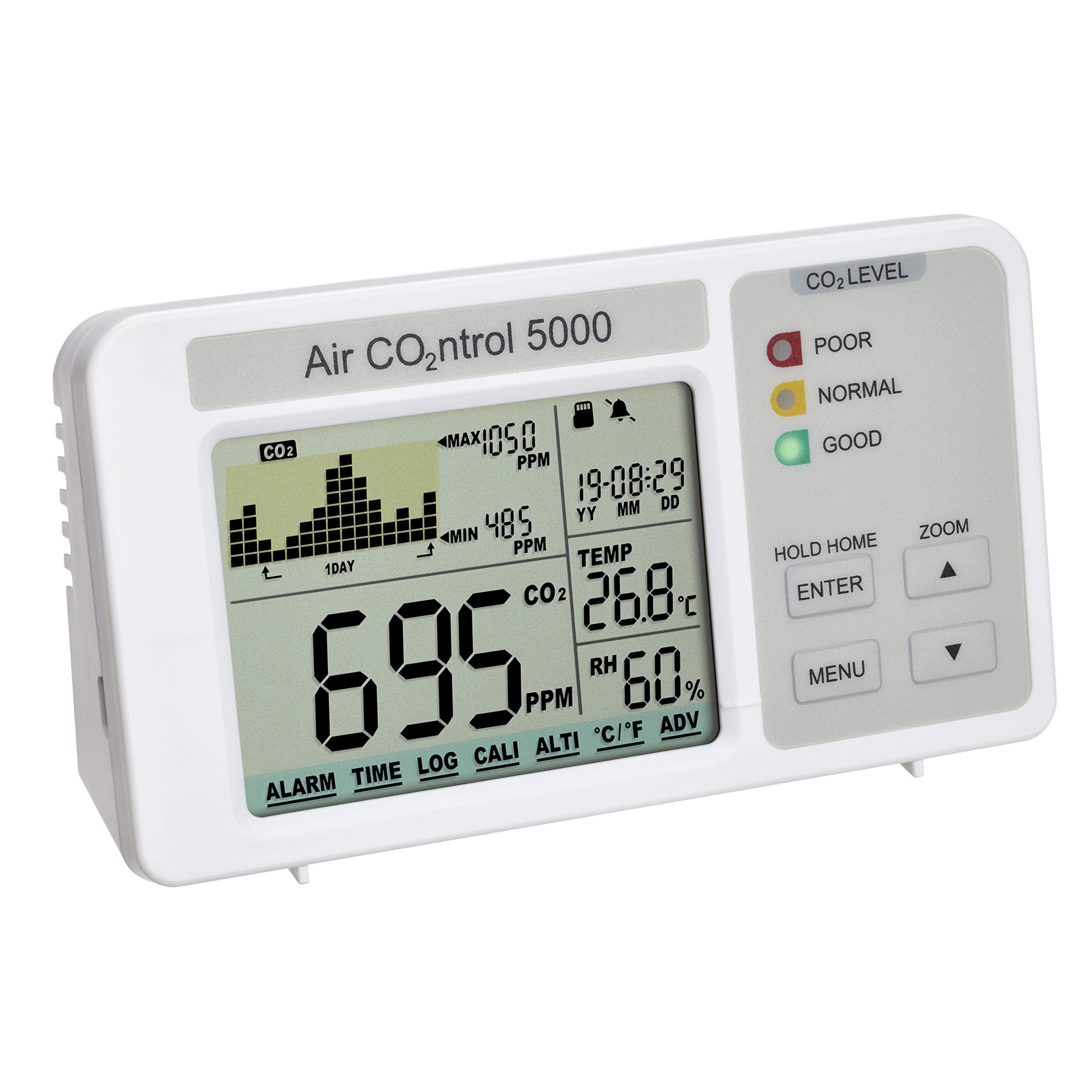 Those who breathe good air are healthier, more content and can do more. Headaches, dizziness and fatigue can often be caused by elevated levels of CO2 in the air. The TFA AIRCO2NTROL 5000 monitor allows you to control how used up and contaminated the air is in rooms where people are located, e.g. schools, offices or public facilities. Thanks to timely and energy-efficient ventilation, you ensure a healthy indoor climate. The AirCO2ntrol 5000 is a CO2 monitor with data logger function via an SD card. In addition to the CO2 content, the device measures the temperature and humidity of the environment and informs you about the date and time. The display shows the current CO2 content as well as a graphic with past values and the corresponding maximum and minimum values. The timeline of the bar graphic can be adjusted to a minute, hour, day or week. On the graphic, the last measured temperature and humidity values can also be clearly displayed. A coloured traffic light indicator allows you to interpret the CO2 values at a glance and changes depending on the air quality and setting of the limits from green to yellow to red. If a specified maximum value is exceeded, an acoustic signal can also warn about too high CO2 concentrations. The extensive data logger function allows the storage of over 1 million data records (CO2 / humidity / temperature along with the date and time) on the included Micro-SD card as a CSV file. The standard measurement interval of five seconds can be individually adjusted. The stored data can then be easily and quickly evaluated using Microsoft Excel. The power supply of the AIRCO2NTROL 5000 is supplied via a supplied power supply via USB cable. Your advantages of the TFA Dostmann's CO2 meter with data logger AIRCO2NTROL 5000 : ? For monitoring the CO2 concentration in rooms. ? Clear 24-hour graphics. ? Data logger function with micro SD card. ? Adjustable alarm. Technical data: ? CO2 measuring range: 0 ... 5,000 ppm. ? Temperature range: 0 ... + 50 °C. ? Humidity measuring range: 5 ... 95 %. ? Material: Plastic. ? Watch movement: Quartz. Installation: Place as appropriate. ? Energy supply: Micro USB. ? Dimensions: (L) 120 x (W) 33 x (H) 66 mm. ? Weight: 103 g. ? Box contents: CO2 monitor, micro SD card, micro-USB cable and operating instructions (English language not guaranteed). TFA Dostmann is a family business headquartered in Wertheim am Main, Germany which specialises in the production of high-quality weather and measurement equipment. It is an industry leader and has already launched over 1,000 products relating to weather, temperature, humidity and time measurement.
