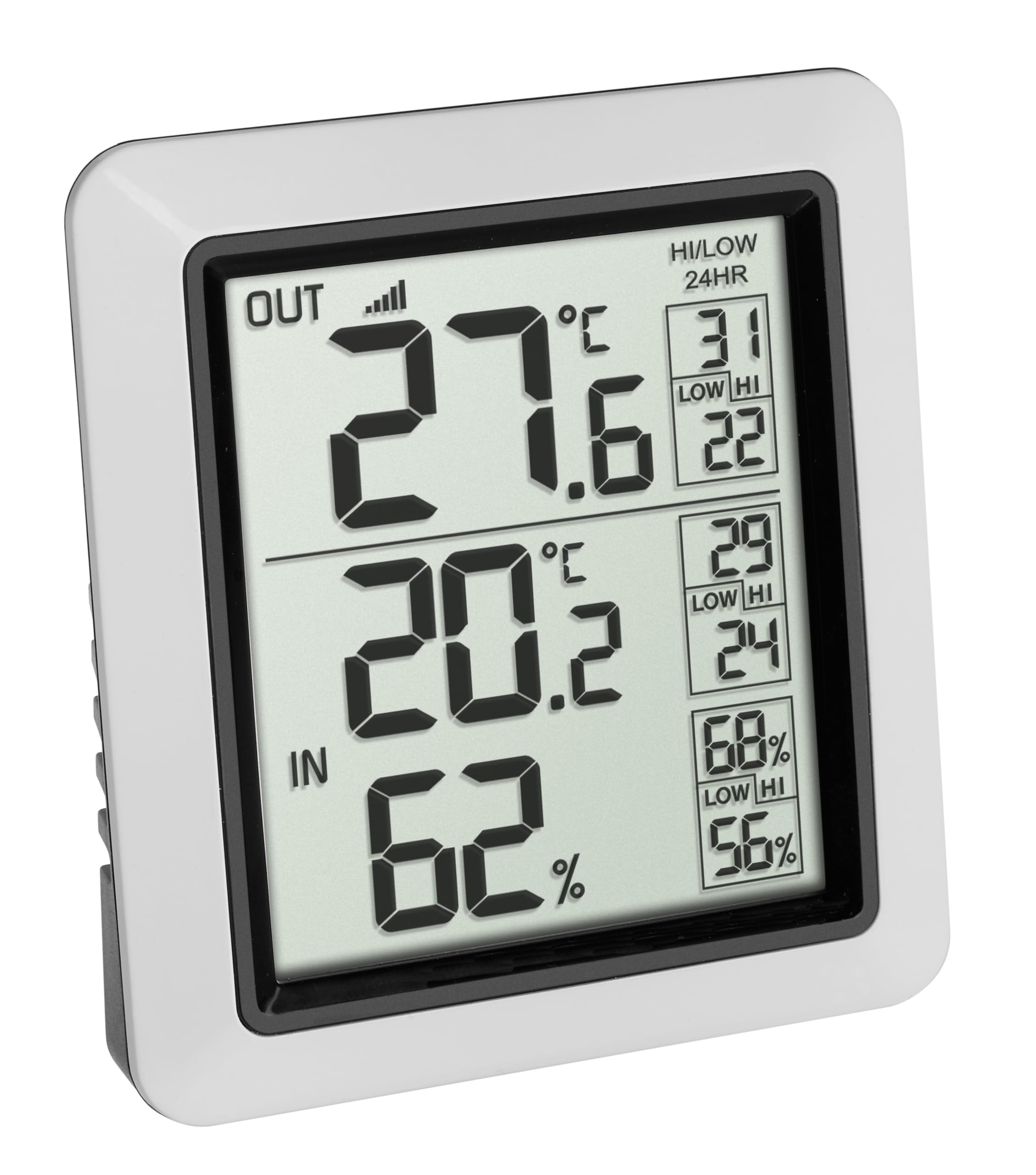 Monitoring the outdoor temperature and indoor climate at the same time - this is made possible with the functional INFO wireless thermometer from TFA. The outdoor temperature on site is determined by the wireless transmitter and shown directly on the clear display of the base station. You also have the room temperature and humidity in view and can regulate the room climate through targeted heating and ventilation. This creates a pleasant and healthy living environment, prevents mould growth and even saves on heating costs. The daily max and min readings are permanently displayed and automatically reset after 24 hours; an additional memory with manual reset allows the observation of peak values over a self-selected period. The device is equipped with a Swiss precision sensor and measures the humidity values very precisely.The benefits of the TFA Dostmann wireless thermometer INFO:? Wireless transmission of outdoor temperature? Indoor climate with temperature and humidity? Permanent display of max. and min. values? Additional max.-min. memory with daily reset? Especially accurate with Swiss precision sensorTechnical data::? Measuring range temperature outdoor: -40...+60°C (-40...+140 °F)? Measuring range temperature indoor: -10...+60°C (+14... +140°F)? Measuring range humidity indoor: 10…99%? Transmitter: 30.3234.02 (max range: 80m)? Transmission frequency: 433MHz? Assembling: To be hung or freestanding? Material: Plastic? Batteries: 1 x AA 1.5 V (base station), 1 x AA 1.5 V (transmitter) (not included)? Dimensions: (L) 77 x (B) 22 x (H) 86 mm? Weight: 104 g? Delivery contents: Base station, temperature transmitter, instruction manualThe family business TFA Dostmann, located in Wertheim , specialized themselves on manufacturing high-quality weather- and measurement equipment. The TFA portfolio offers a variety of products in different categories such as weather, temperature, humidity, cooking and time measurements. Today TFA Dostmann became one of the leading companies in the industry in Europe.