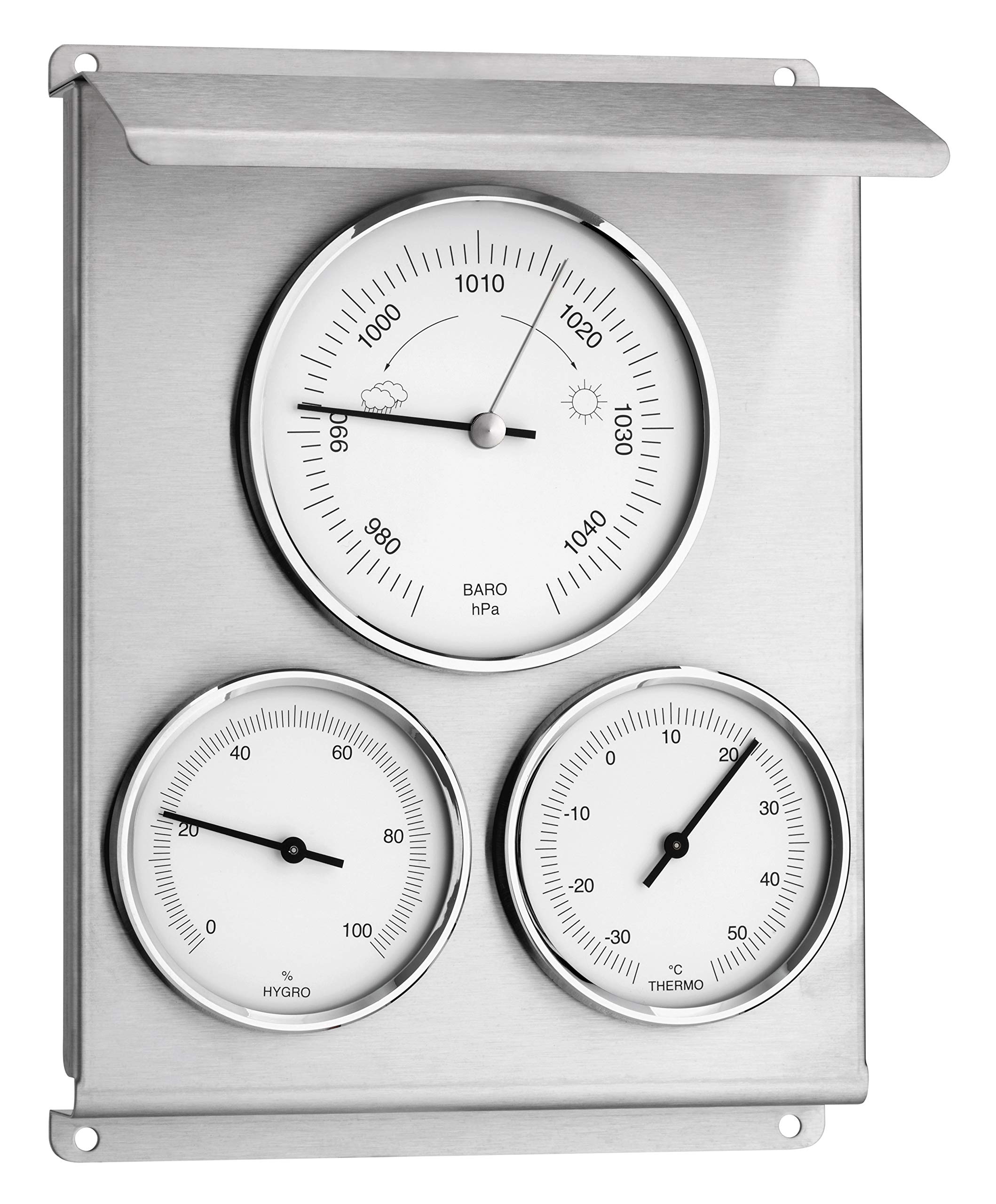 Product DescriptionStainless steel weather station displays current temperature, the relative humidity and current barometric pressure. There is an adjustable pointer to help you determine the barometric pressure trend. Accurate temperatures: ±1.5 °C (0 - 35 °C), others ±2 °C · Accuracy: air pressure: ±3 hPa · Accuracy of humidity: ± 8%. Box Contains1 x thermometer1 x fixing material1 x Product Manual