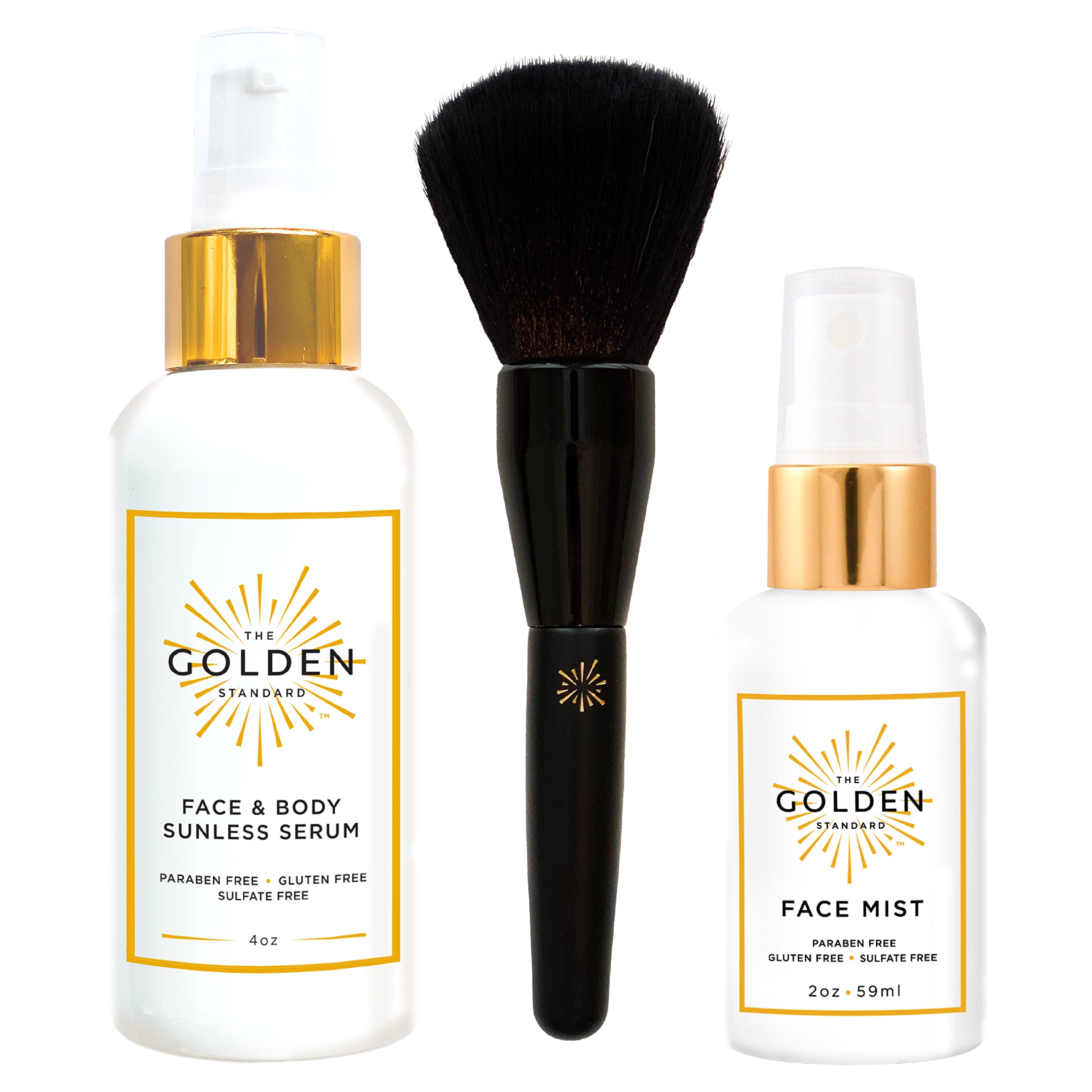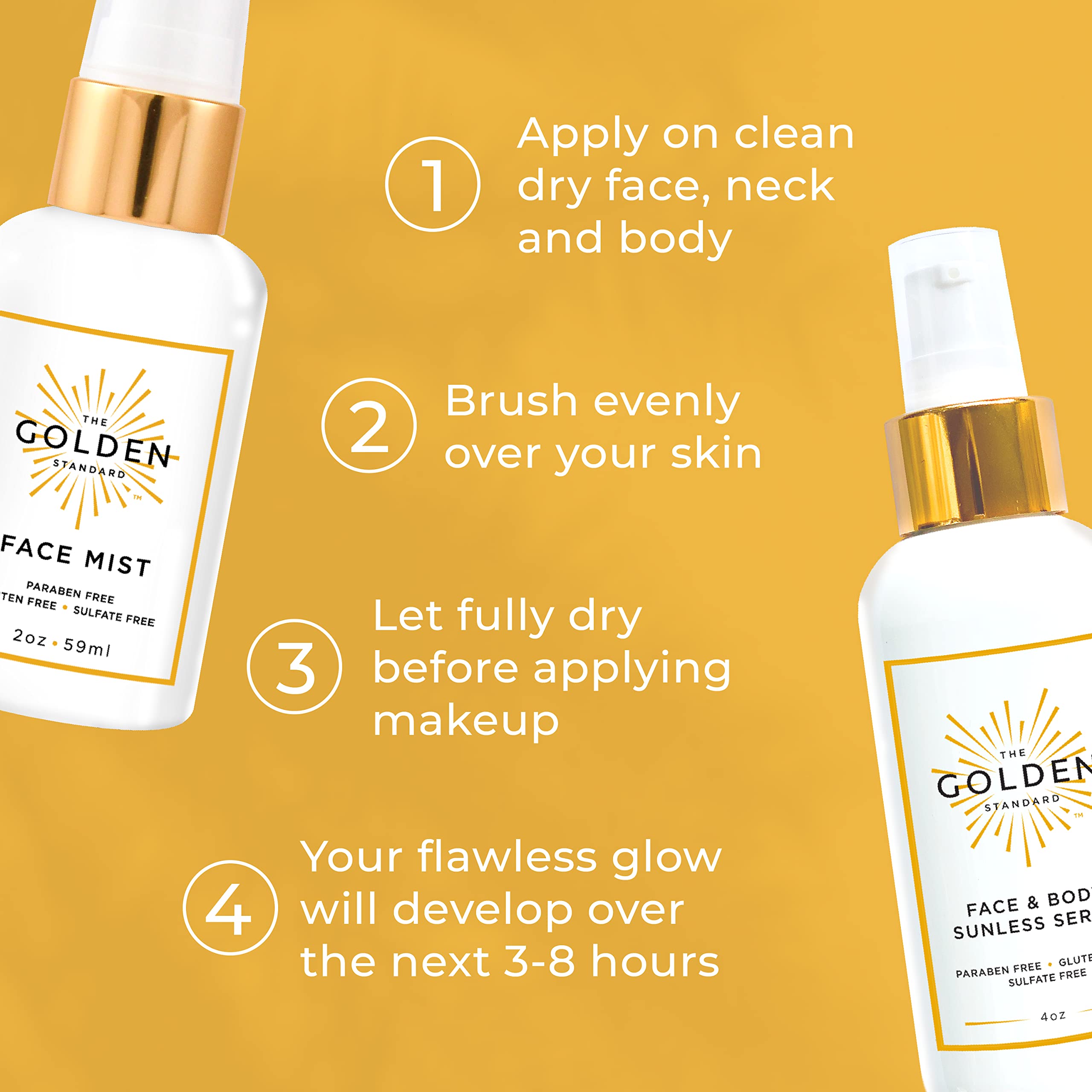 The Golden Standard We've Got You Covered Combo - Face & Body Sunless Serum and Face Mist with Brush - Natural and Hydrating Flawless Sunless Self Tanning for a Buildable Tan - Cruelty Free (2 oz)