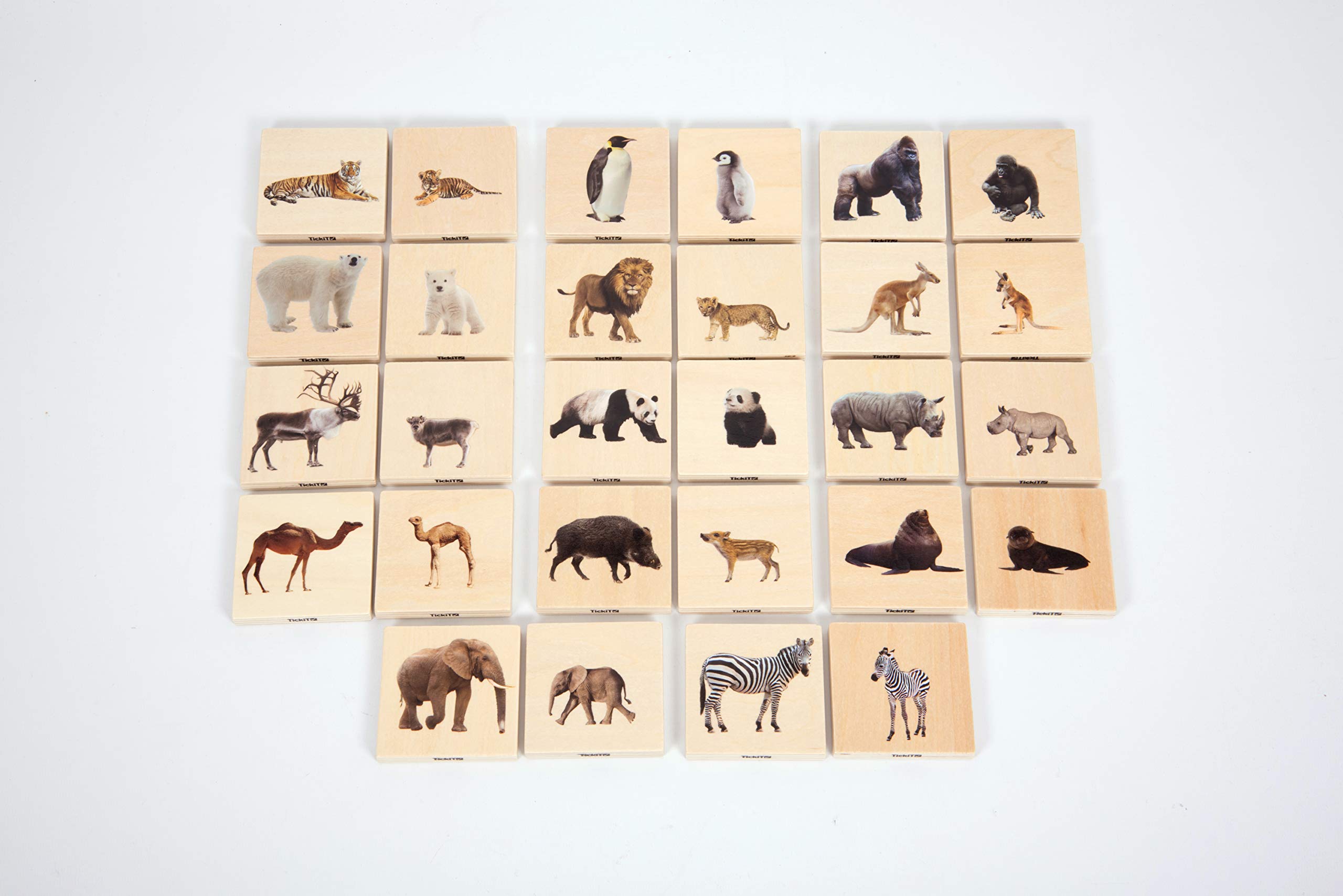 Product Description14 pairs of smooth and tactile beech plywood square tiles, each colour printed on one side with clear detailed photographic images of real wild animal adults and their young. The chunky tiles are easy for small hands to grip, rotate and turn over.This versatile set provides endless opportunities for exploring the fascinating animal kingdom and can be used in a number of ways:1. As a matching game - turn all the tiles face up and match the adult animal with its corresponding infant.2. As a memory game - turn all the tiles face down and try to remember where the matching animal family pairs are located.3. For sorting into groups - e. g. by habitat, continent, skin type (skin, fur, hair or feathers), or ordered by size.Ideal for promoting discussions about how and where animals live, what they eat, which are - or have - predators, what dangers the animals face from each other, the environment or from humankind, and the differences between the adults and their young.Children will enjoy playing whilst developing several aspects of learning, including descriptive language, mathematical language, collaborative play, fine motor skills, imaginative play and understanding the wider world around them.Includes colour identification guide in 7 languagesSafety WarningNot Suitable for Children Under 12 Months