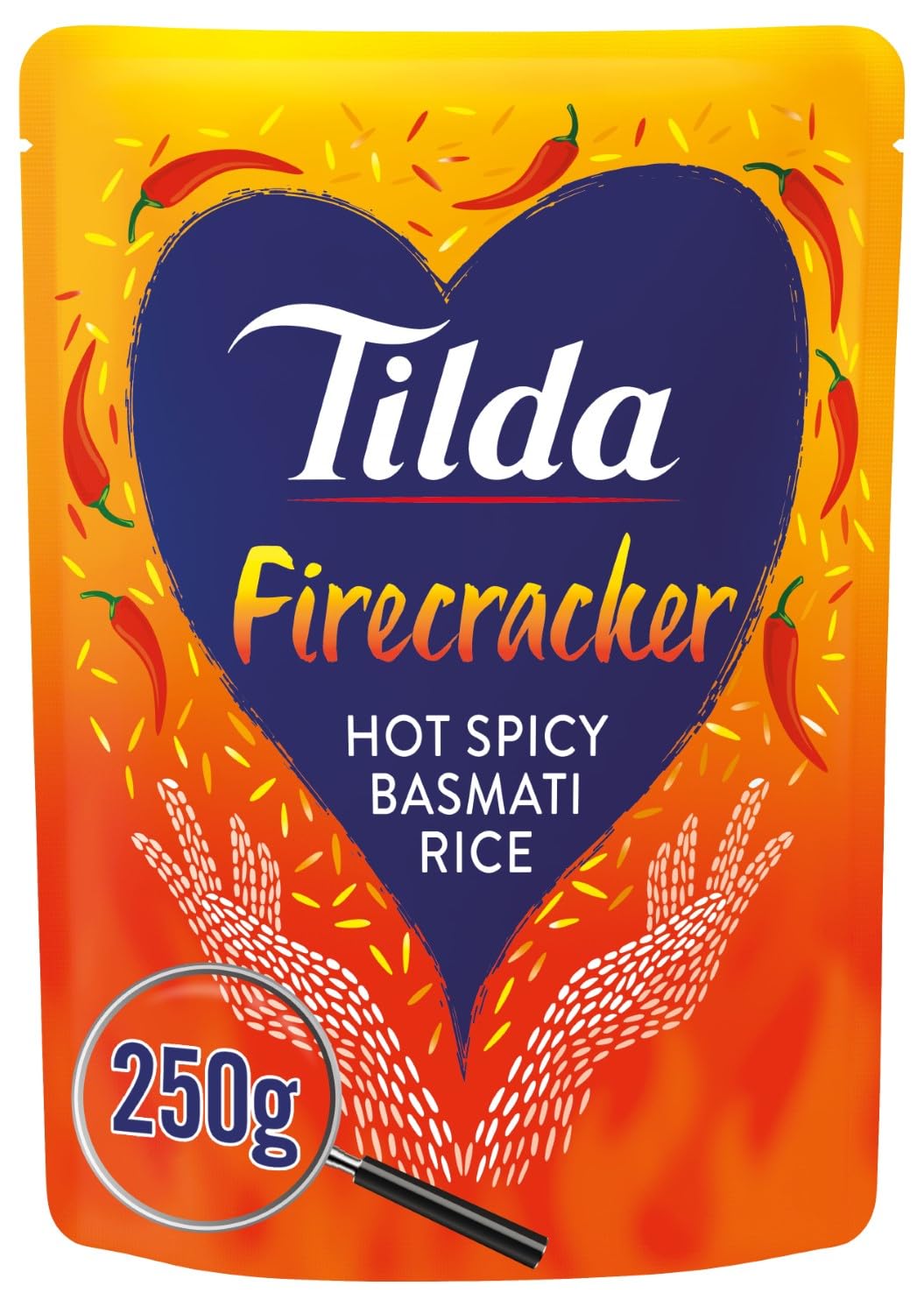 DescriptionProduct DescriptionTilda Hot Firecracker Steamed Basmati Rice with a tantalizing blend of vibrant natural ingredients including; red chilly, ginger, Szechuan pepper, soy sauce and garlic for a sweet and fiery taste. Be transported to the Far East with a recipe which captures the vibrancy of a Chinese street food market, through its distinctive fusions of heat, smokiness and zesty aromas. Available in 250 g pouch.IngredientsNatural Basmati Rice-Steamed (92%), Red Chilli (2.4%), Sunflower Oil, Tomato Paste, Garlic, Soy Sauce (contains Soya), Salt, Natural Colour (Paprika Extract), Smoked Paprika, Ginger, Cayenne Pepper, Szechuan Pepper.DirectionsSqueeze pouch before heating and tear top corner of pouch open to 2cm. 800W - Heat upright in microwave on full power for 2 minutes. Tear open, tip out and fluff with a fork before serving. Alternatively, warm a small, non-stick pan over a low heat. Add rice and 2 tsps of warm water. Warm through for 3 minutes on a medium heat, continuously stirring. Serve straight away.Safety WarningDo not consume if pack is damaged or pierced.Manufacturer Contact InformationTilda, PO Box 550, Rainham, RM13 9AE, UK.