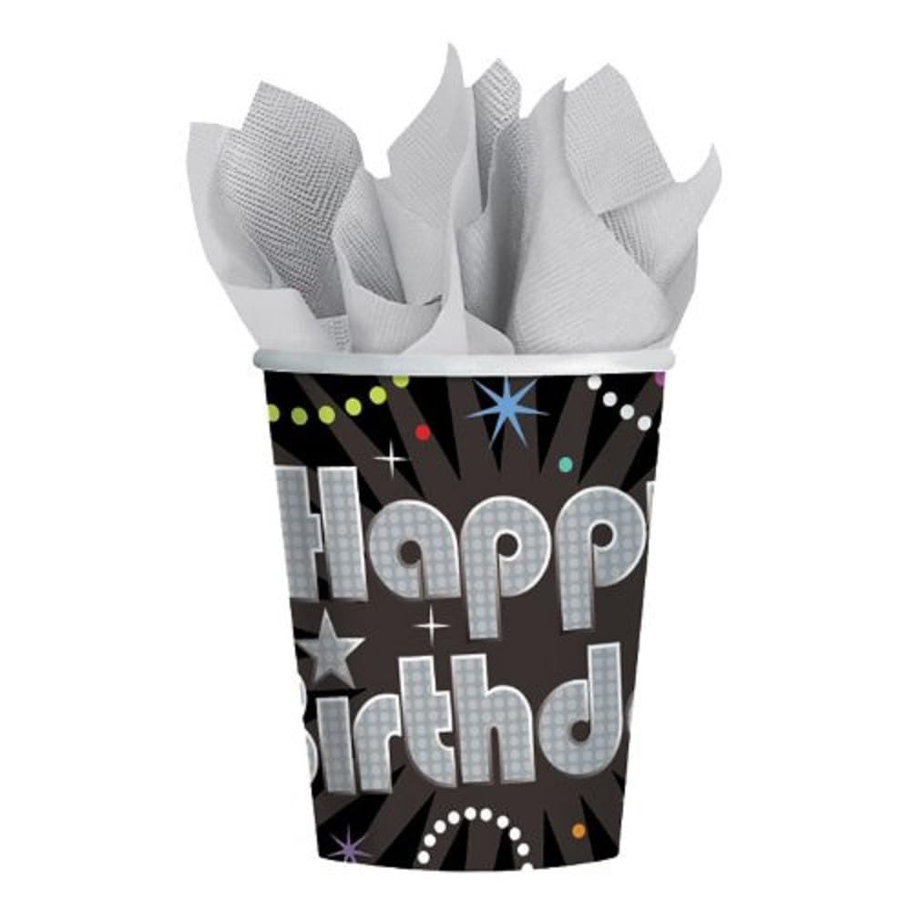Serve birthday drinks in our Time To Party Paper Cups! Each cup features black background with colorful stars and the message "Happy Birthday". Holds 9 oz. Includes 8 paper cups per package.