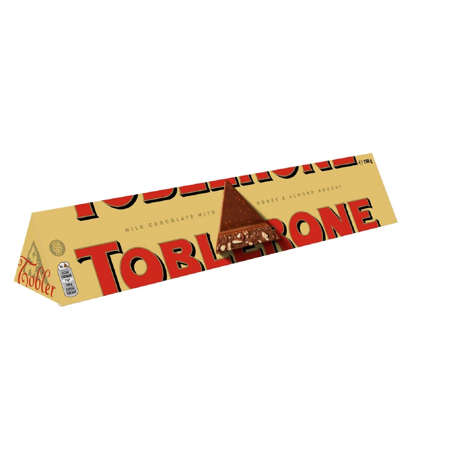 DescriptionProduct DescriptionEmbrace the exceptional taste of Toblerone Milk Chocolate, enriched with honey and almond nougat. As Toblerone champions the triangles, it stands out in a world of squares, celebrating those who dare to be different. This 750g bar captures the spirit of embracing uniqueness and the courage to be inventive. Crafted with sustainably sourced cocoa, it's a delightful treat that resonates with Toblerone's rich legacy and commitment to quality established in Switzerland since 1908.IngredientsSugar, Whole MILK Powder, Cocoa Butter, Cocoa Mass, Honey (3%), MILK Fat, ALMONDS (1.6%), Emulsifier (SOYA Lecithins), EGG White, Flavouring, Milk Chocolate contains: Cocoa Solids: 28% minimum, Milk Solids: 14% minimumSafety WarningsafeBox ContainsMilk chocolate with honey and almond nougat (10%).Manufacturer Contact InformationCadbury House, Sanderson Road, Uxbridge, UB8 1DH.