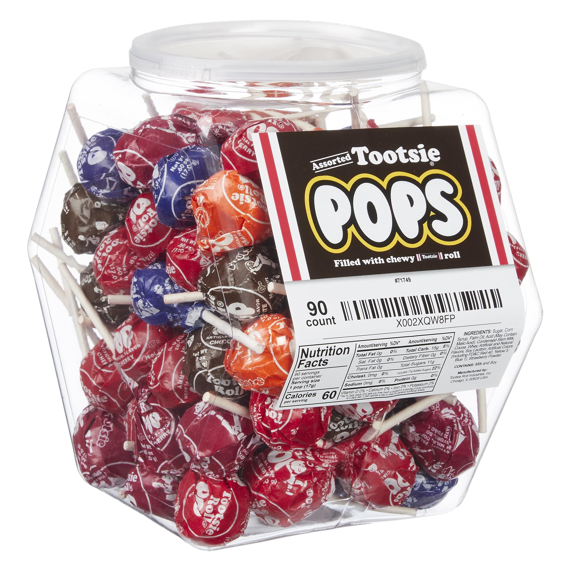 This Bulk Candy Tub is filled 90 Tootsie Pops (3.83 pounds of candy). These delicious lollipops have the added delight of a chewy tootsie roll inside. Package includes an assortment of flavored suckers.BULK SUPPLY OF CANDY - FAMILY SIZE THAT IS GREAT FOR PARTIESDesigned for anyone with a sweet tooth, this whole supply of candy is perfect for any occasion. Each piece of candy comes individually wrapped. Set this candy dish on your office desk to share in the sugar indulgence with your coworkers. Use this bulk candy as pinata filler for birthday parties or stocking stuffers for the family. Great for holidays, college dorm rooms, wedding receptions, party favors, movie nights, and anyone with a sweet tooth.PACKAGED IN REUSABLE PLASTIC CANDY JARThis large amount of candy comes packed in a clear plastic tub that is ideal for candy tables and candy buffets. The lidded design makes it easy to store. Once you finish off your candy supply, this reusable candy dispenser can be refilled with bags of candy. Not just for candies, this container can be used afterwards to collect change. Transparent plastic tub measures 7.5 x 5.25 x 8.25 inches.
