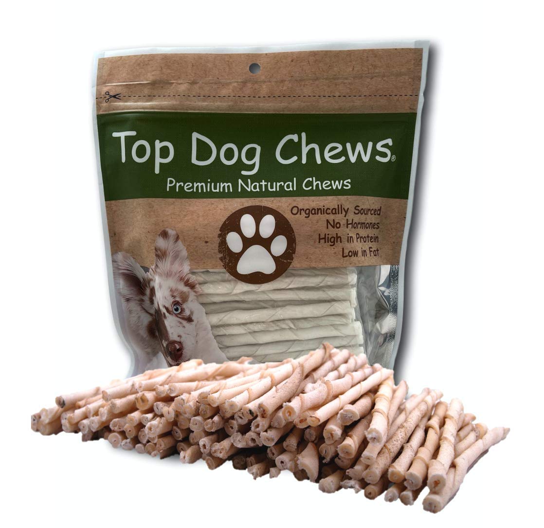 These thick braided twists naturally clean teeth as dogs chew. Made with natural, premium-quality rawhide. These come in a pack of 100. The will vary in size but basically measure 5-inch length by 5/6MM width.
